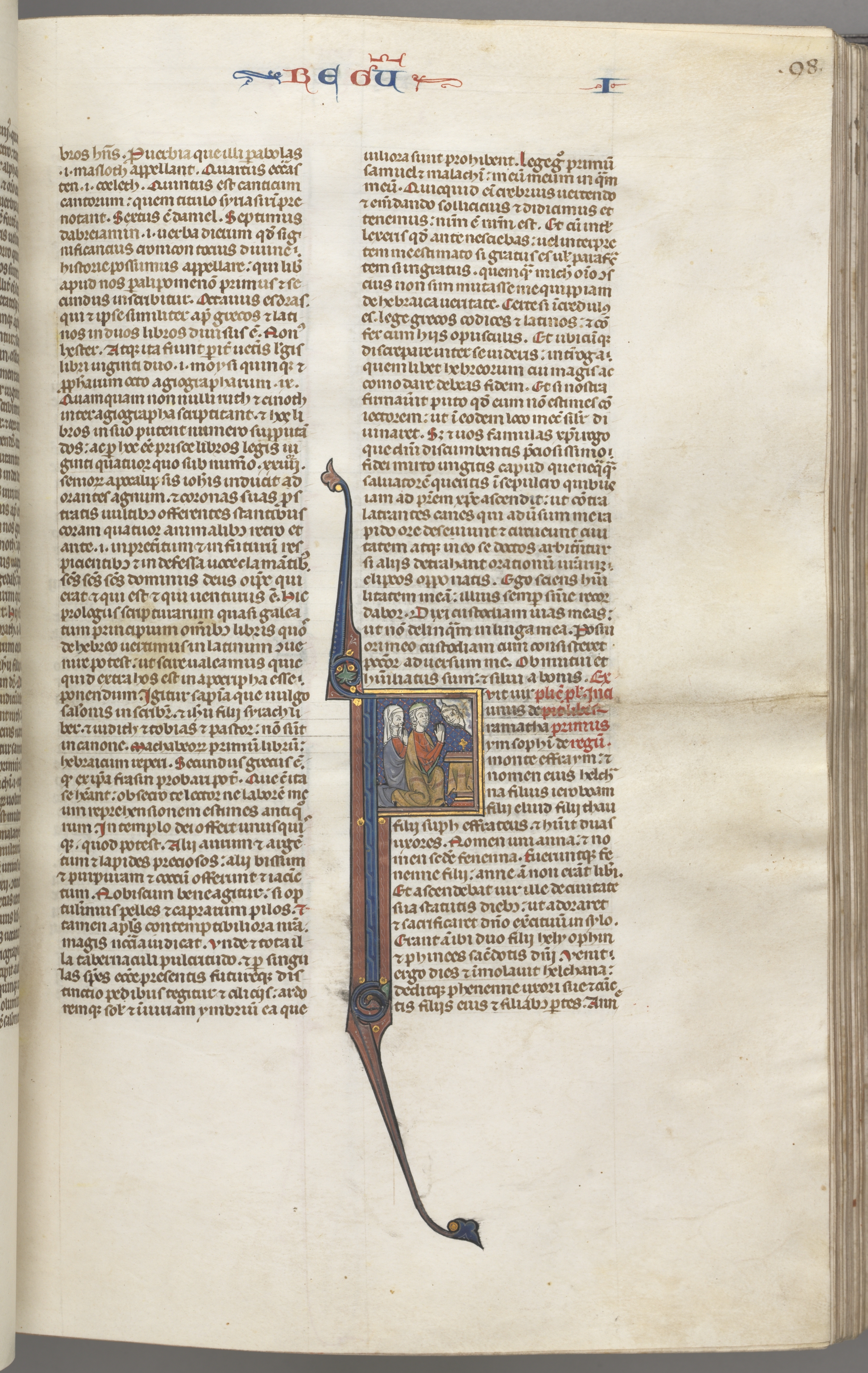 Fol. 98r, Kings I, historiated initial F, Elkanah and Hannah kneeling before an altar with God appearing above