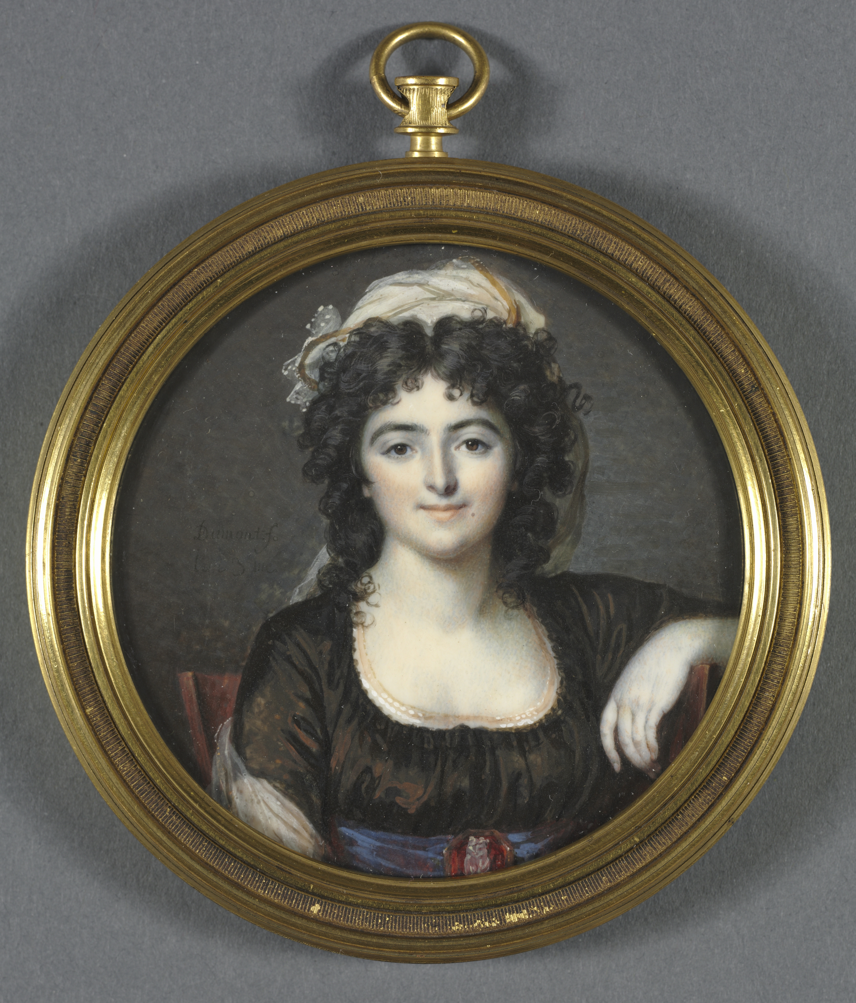 Oval gold-framed portrait. The woman has curly dark hair. The woman's hair is partly covered with a white headscarf. The woman wears a brown dress. The woman's left arm rests on a surface. The woman wears a blue sash around her waist with a red bow. The portrait is set against a dark gray background. The frame has a loop at the top. The frame has a ribbed edge.