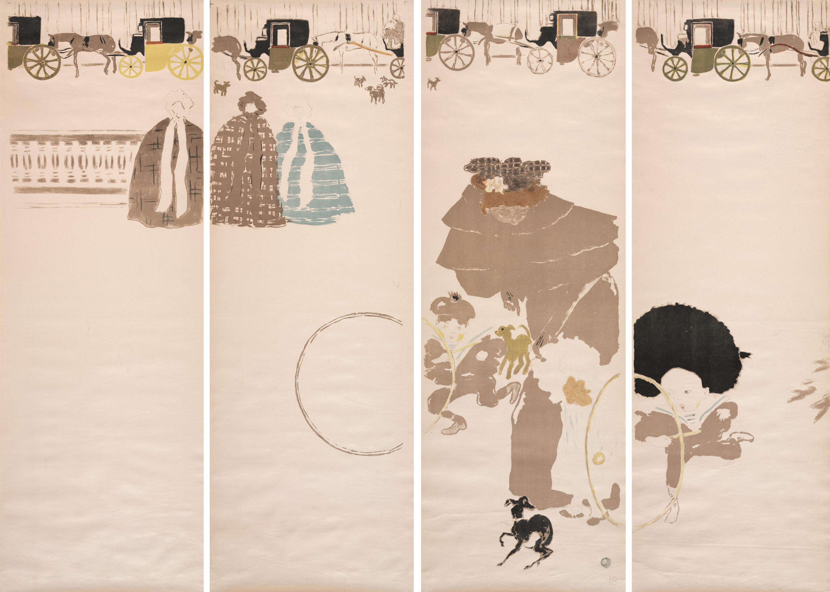 The image is a triptych painting, divided into three panels. The background of the painting is a light beige color. The top of the painting depicts a frieze of horse-drawn carriages in various colors including black, yellow, green, brown and tan. The carriages are drawn by horses or a donkey and some have people inside. There are also some small dogs depicted. In the middle panel, a woman wears a large brown hat and a long dress. She holds a flower and appears to be standing still. A child in a black hat and dress runs to her right. The child holds a hoop and stick. A small black dog runs near the child. On the left panel, there are two nursemaids. One nursemaid wears a dark-colored dress with a white scarf. The other nursemaid wears a blue and white striped dress and a brown patterned shawl. Both nursemaids appear to be standing still and looking to the right. The right panel is mostly empty, with a small section of the child's dress visible. The overall style of the painting is reminiscent of the Art Nouveau and Nabi movements.