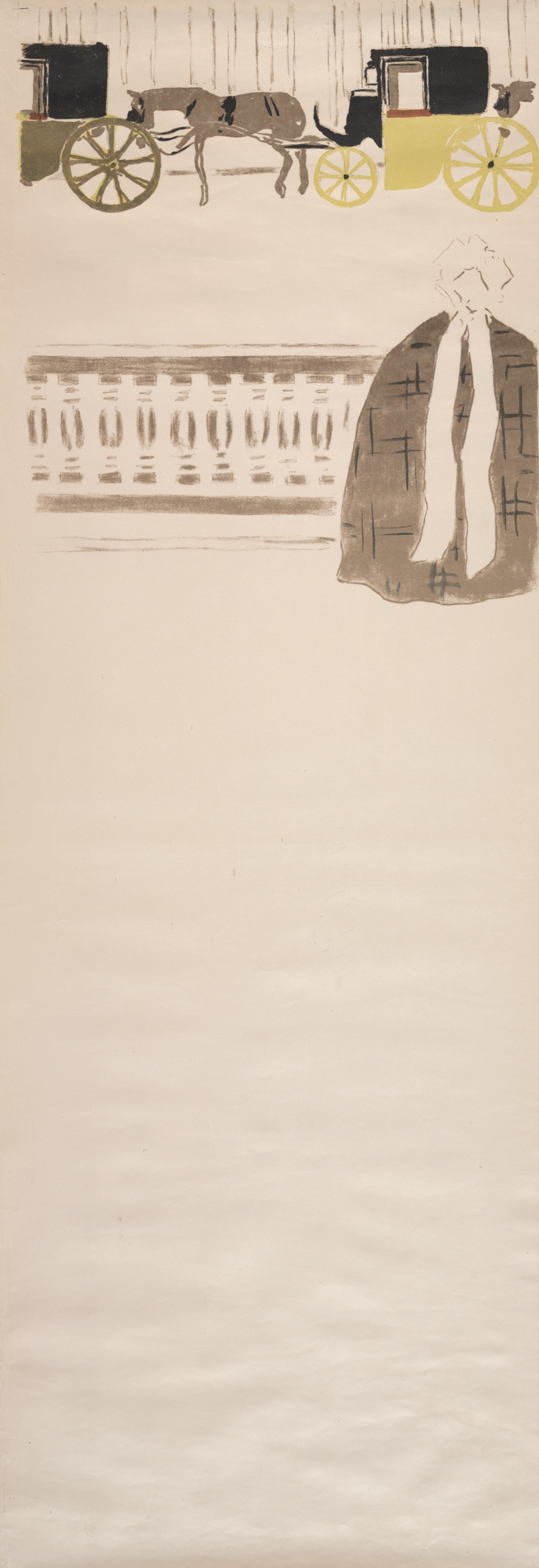 The painting features a woman wearing a hat and coat with a white scarf, located on the right side. A horse-drawn carriage with a yellow body and black top is shown at the top, pulled by a brown horse. The carriage has large yellow wheels and a driver. A low wall or railing is depicted below the carriage. The background of the painting is a light beige color.