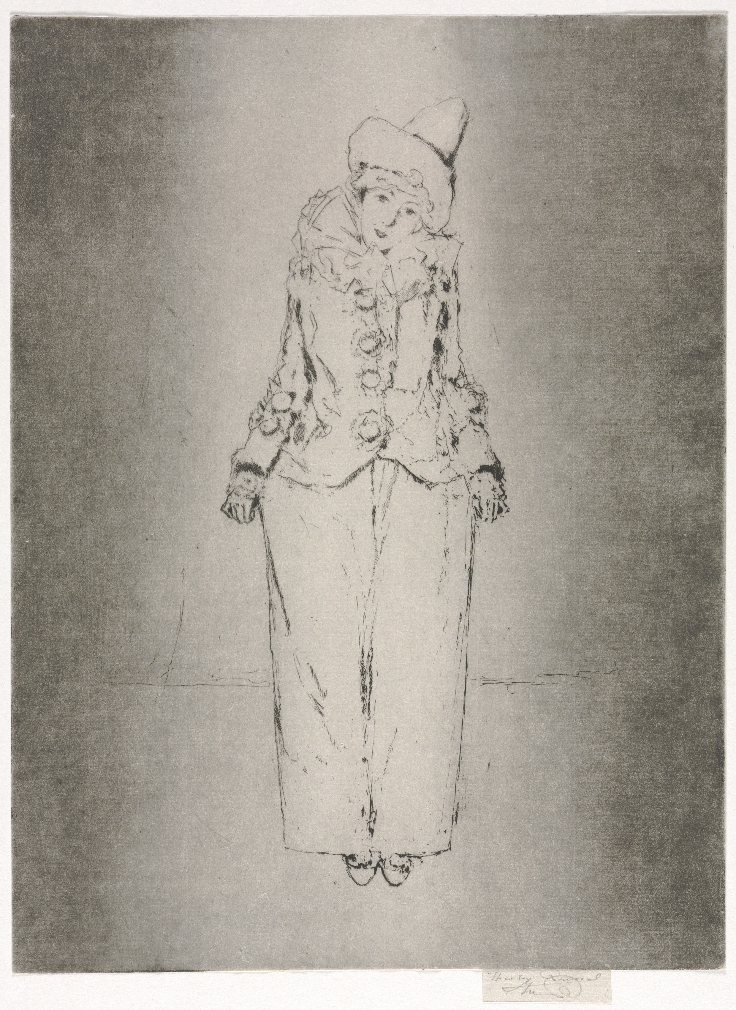 Monochromatic drawing of a standing figure. The figure wears a long dress and jacket with ruffles. A hat resembling a jester's hat is on the figure's head. The figure's face shows minimal detail. A small signature is at the bottom. The background is plain with shading.