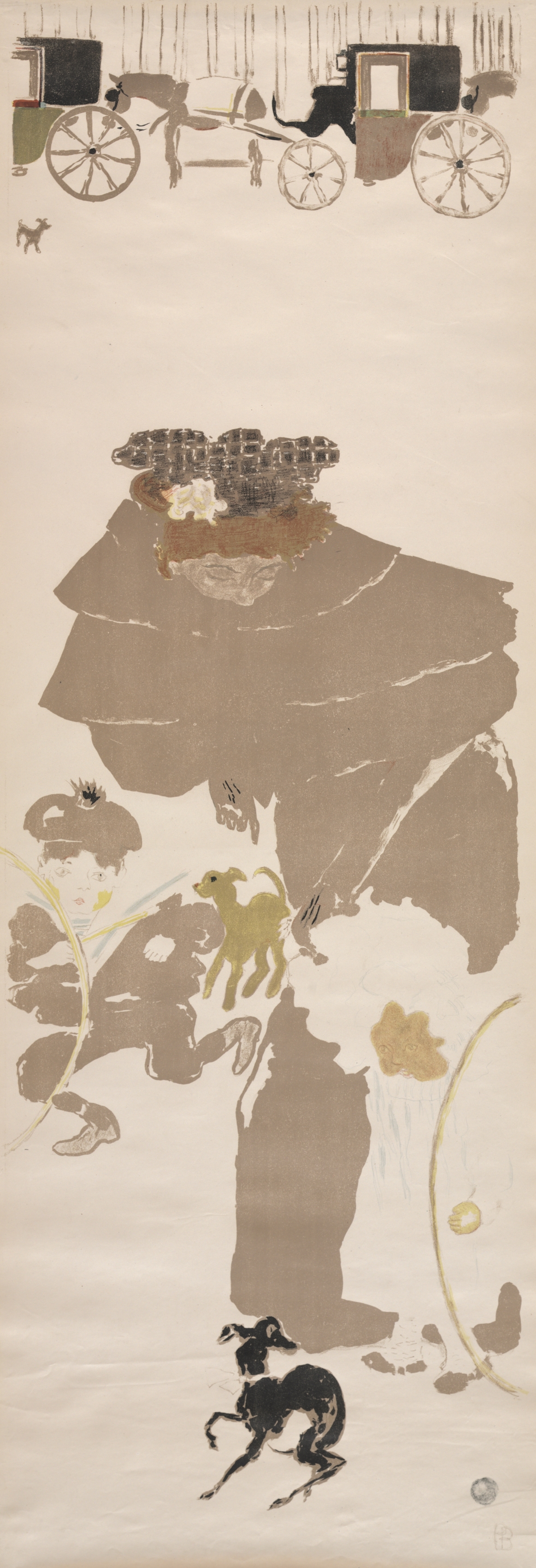The image depicts a tall, narrow painting of a frieze of carriages and nursemaids. At the top, there are two horse-drawn carriages with people and a dog. The carriages are drawn in shades of brown, green, and black. Below the carriages, there is a large brown silhouette of a woman or nursemaid wearing a dress and a hat. She appears to be holding a child. A small yellow dog runs next to her and a black dog runs in front. There are plants with flowers on the right side. The background of the painting is a light beige color. The overall style of the painting is impressionist.