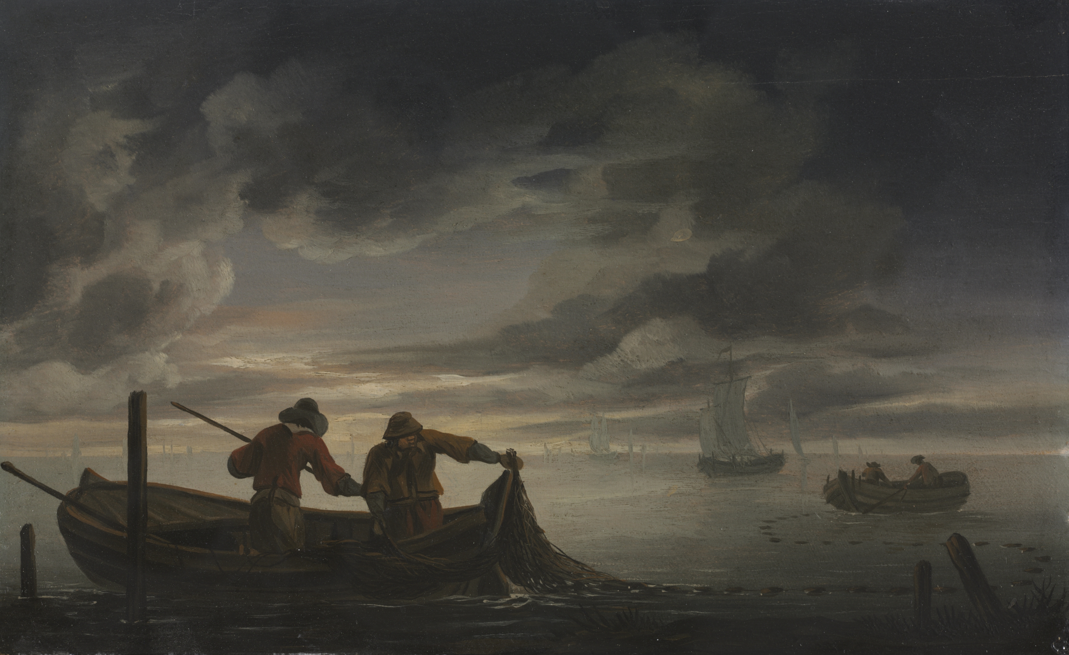 An estuary scene with a body of water, a cloudy sky, and a few boats. In the foreground, two men in a small wooden boat are pulling a net. The man on the left wears a red shirt, a wide-brimmed hat, and faces away from the viewer. The man on the right wears a brown jacket and hat, and also faces away from the viewer. The boat has a long oar and is tied to a wooden post. In the background, a larger boat with white sails and a city skyline are visible. Another small boat with two people is on the right side. The sky is dark and cloudy, with shades of gray, white, and orange. The overall atmosphere is gloomy and subdued, with muted colors.
