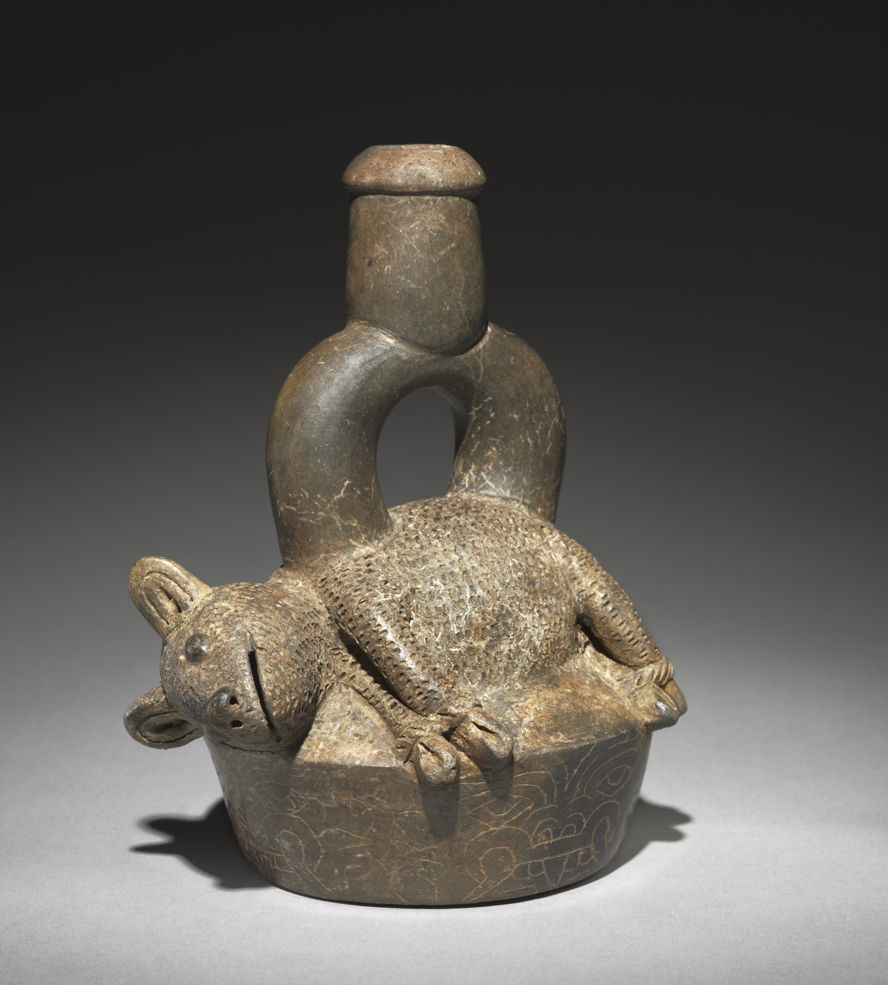 The image depicts a ceramic vessel shaped like an animal lying on its side, resembling a rodent, with a loop handle rising from its back and ending in a small cylindrical opening. The vessel is primarily brown with a textured surface. The animal has large ears, small legs bent underneath its body, and a long snout. The base of the vessel is round and flat with an etched design around it. The background transitions from dark gray at the top to light gray at the bottom. The title is "Vessel with Pudu", by artist unknown.