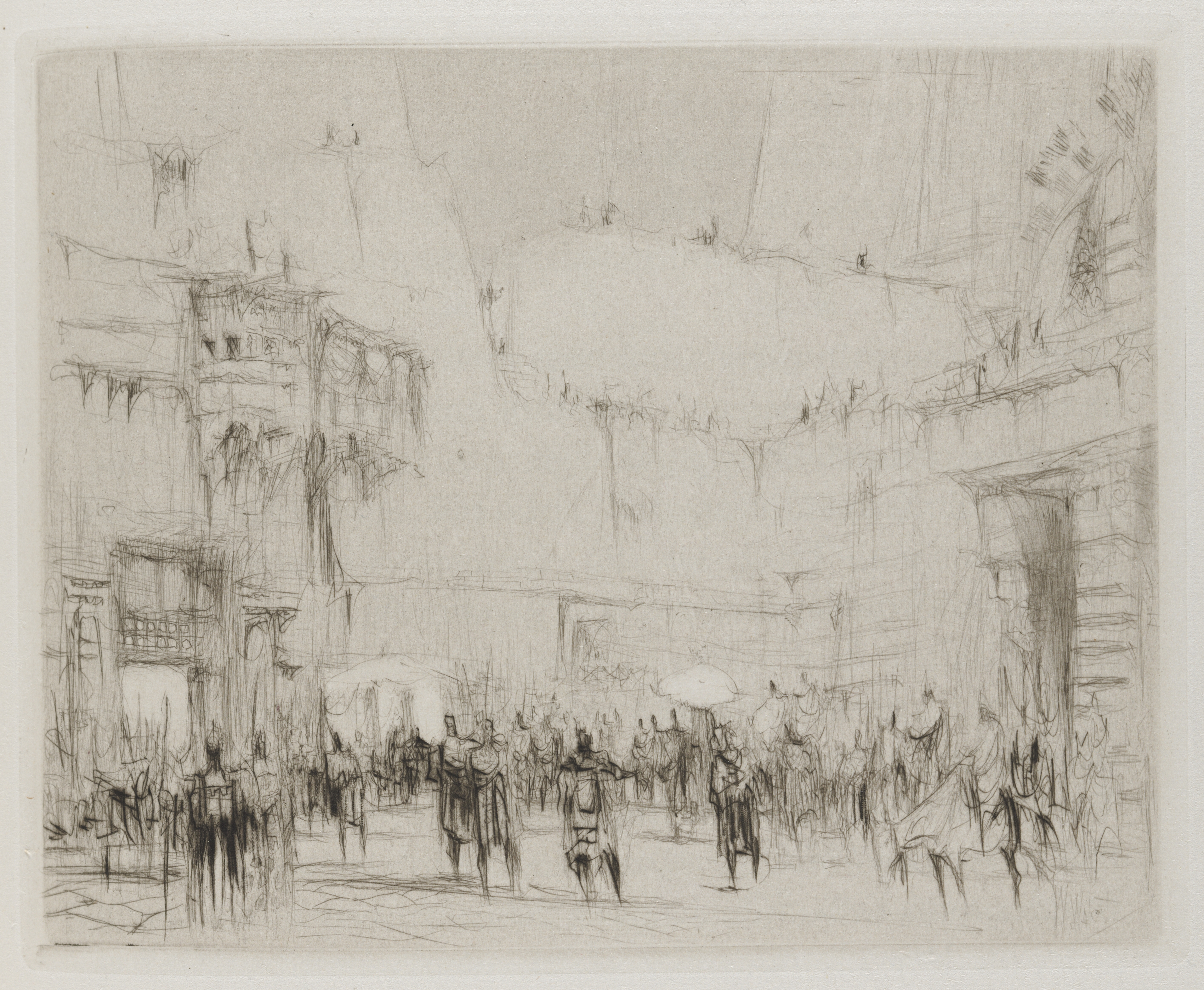 The image shows a sketch of a large group of people on a street. The scene is drawn in shades of gray on a beige background. Buildings line the street on both sides. The buildings are tall with flat roofs and have archways and columns. The street is filled with people dressed in old-fashioned clothing, some on horseback and some on foot. The people appear to be moving in different directions. Some are wearing hats. A few are holding umbrellas. The overall atmosphere suggests a busy, possibly historic, city scene.