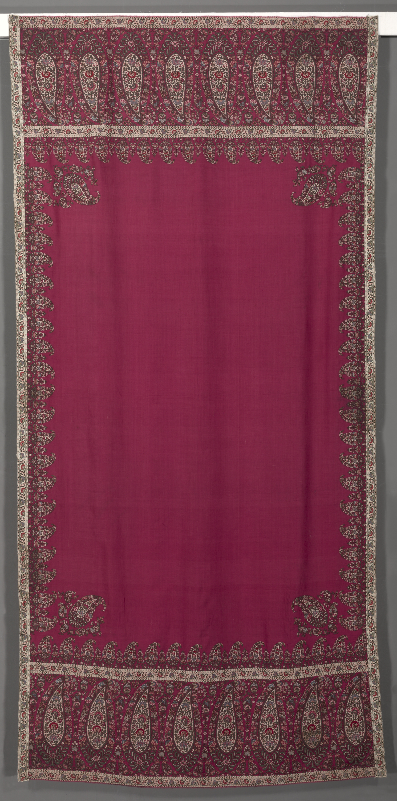 Long Shawl by Hermès. The image shows a rectangular piece of fabric with a solid burgundy center. The fabric has a border around the edges with a paisley and floral pattern in shades of beige, brown, and red. The top and bottom borders are wider than the side borders and feature a repeating paisley design. The corners of the fabric have a floral pattern. The background behind the fabric is gray.