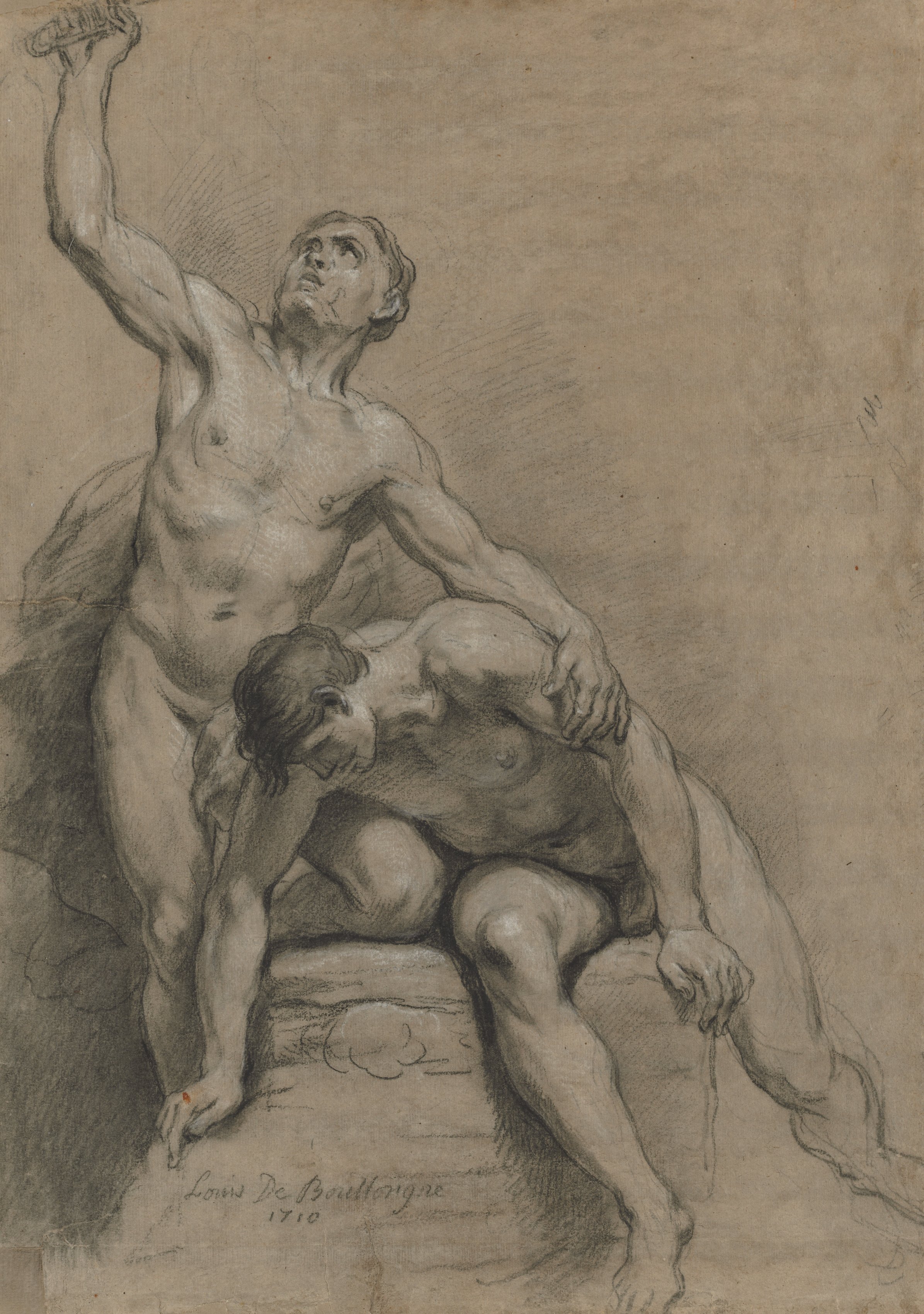 Two nude males; one standing with left arm raised; one sitting. Brown background. The drawing is titled "Two Male Nudes" and was drawn by Louis de Boullogne. The standing male has his right hand on the other's right arm. The sitting male sits on a base or rock; he has his head leaning down and to the side; left arm hanging down. The standing male looks up and to the right; right knee slightly bent; drapery behind.