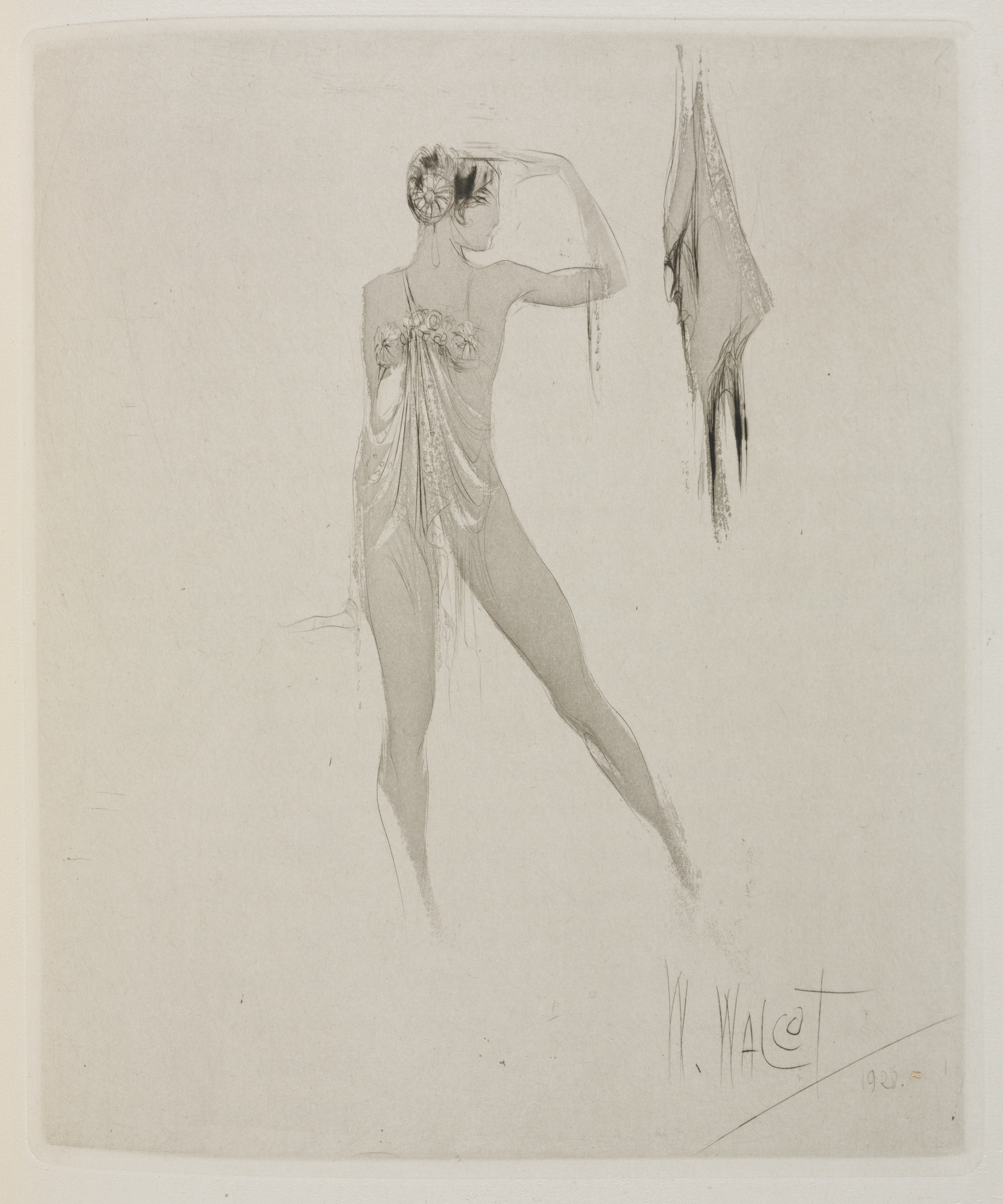 A woman wearing a dress with a low back and a short skirt that is gathered at the waist and a floral wreath on her head. Her left hand is on the back of her head and her right arm is down. She is facing the right. A dress or shawl hangs on the right. The signature is in the bottom right corner. The image is in shades of gray.