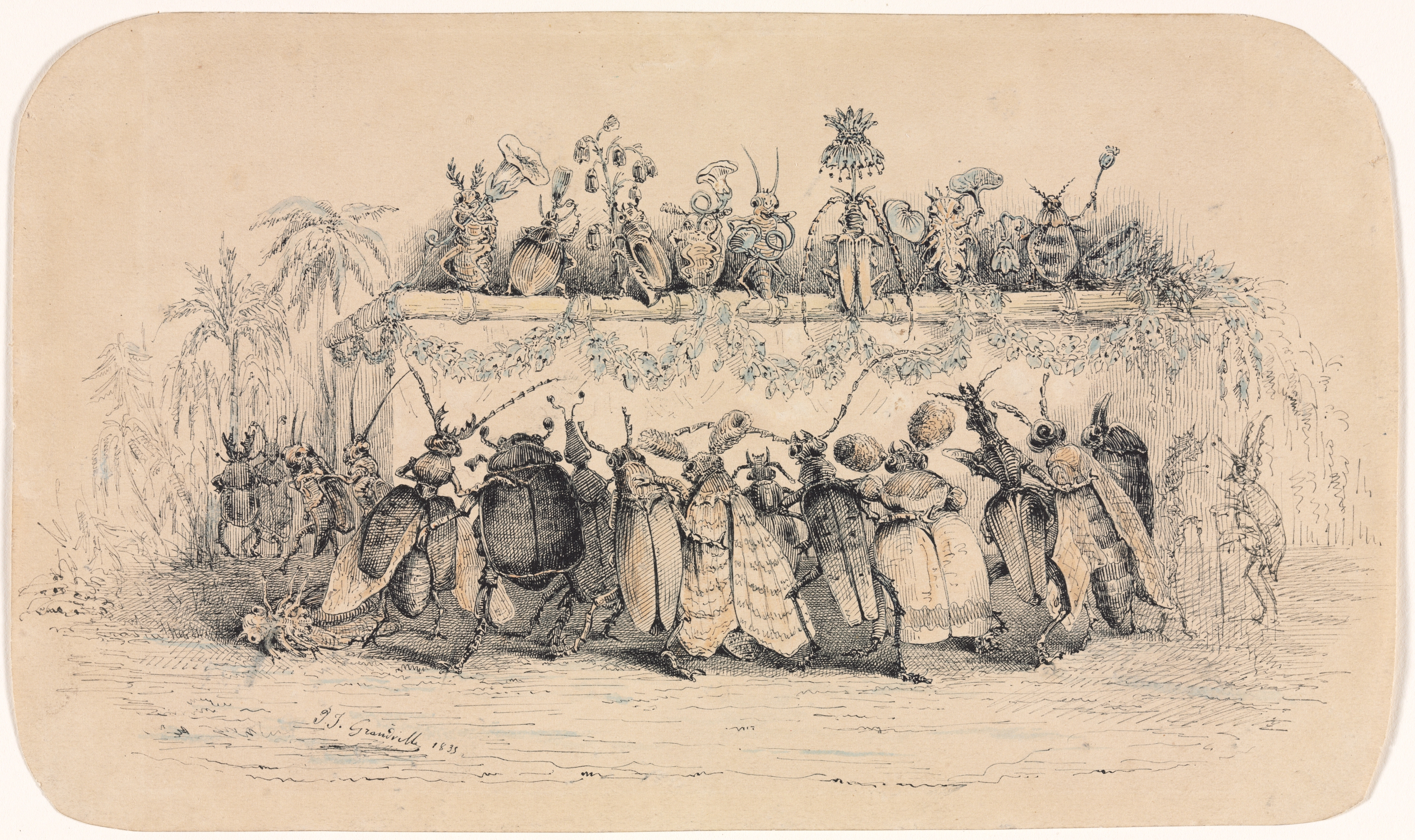 An insect ball. A drawing of a group of insects dressed in formal attire, standing in two rows. The insects are drawn in black and white. The lower row consists of 13 insects, and the upper row consists of 8 insects. The background features a tropical setting with trees, plants, and foliage. The paper appears to have a light brown color with rounded corners. The image depicts a scene titled "An Insect Ball" by Jean-Jacques Grandville.