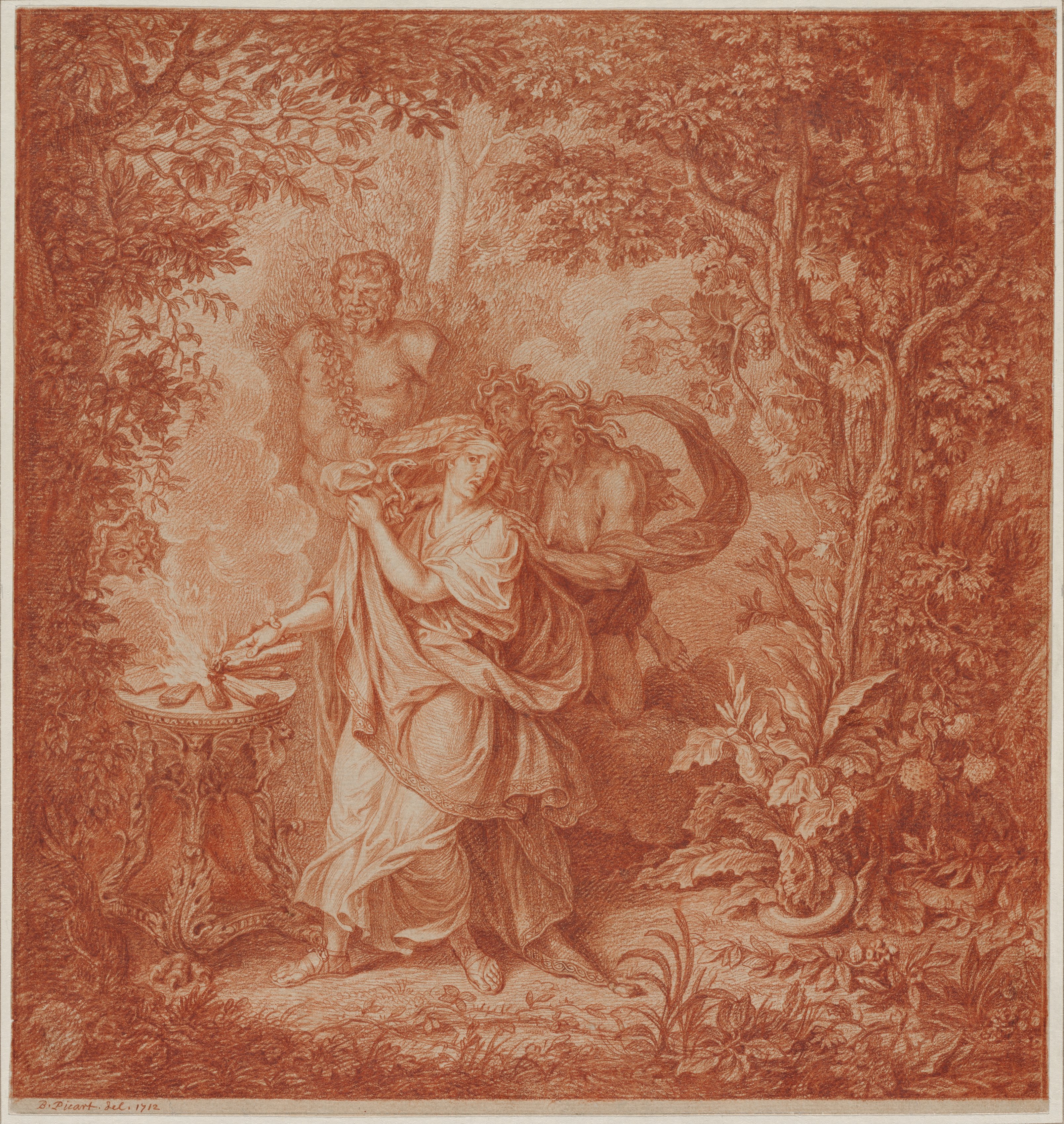 Sepia-toned drawing of a woman in a long dress holding a piece of wood over a fire. A man with horns and another muscular man are behind her. All three figures are surrounded by trees and foliage. The woman is barefoot and wearing a headband, with her dress draped over her shoulder. She appears to be walking or turning towards the other two men. The man in front of her has horns and a long tail. The muscular man behind her has a beard and no shirt. He stands on a rock or tree stump. A small table-like object with legs holds the fire. The overall scene appears to be a forest or woodland setting.