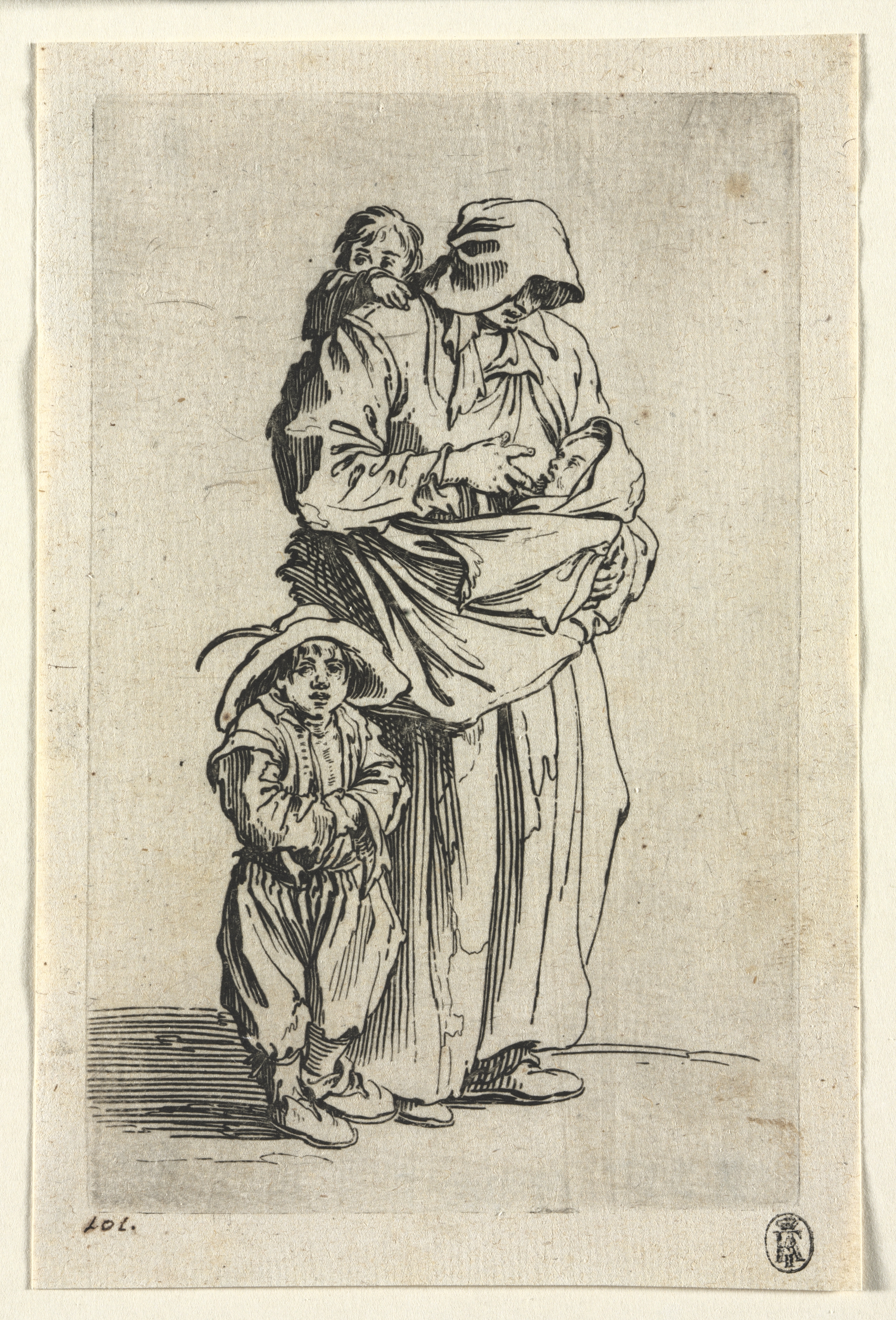 Black and white drawing of a beggar woman with 3 children. The woman is standing and wearing a head covering, long dress. She holds an infant in the crook of her right arm and a toddler on her back. A second toddler stands to her left. All four people wear hats and simple clothing. The background is plain.