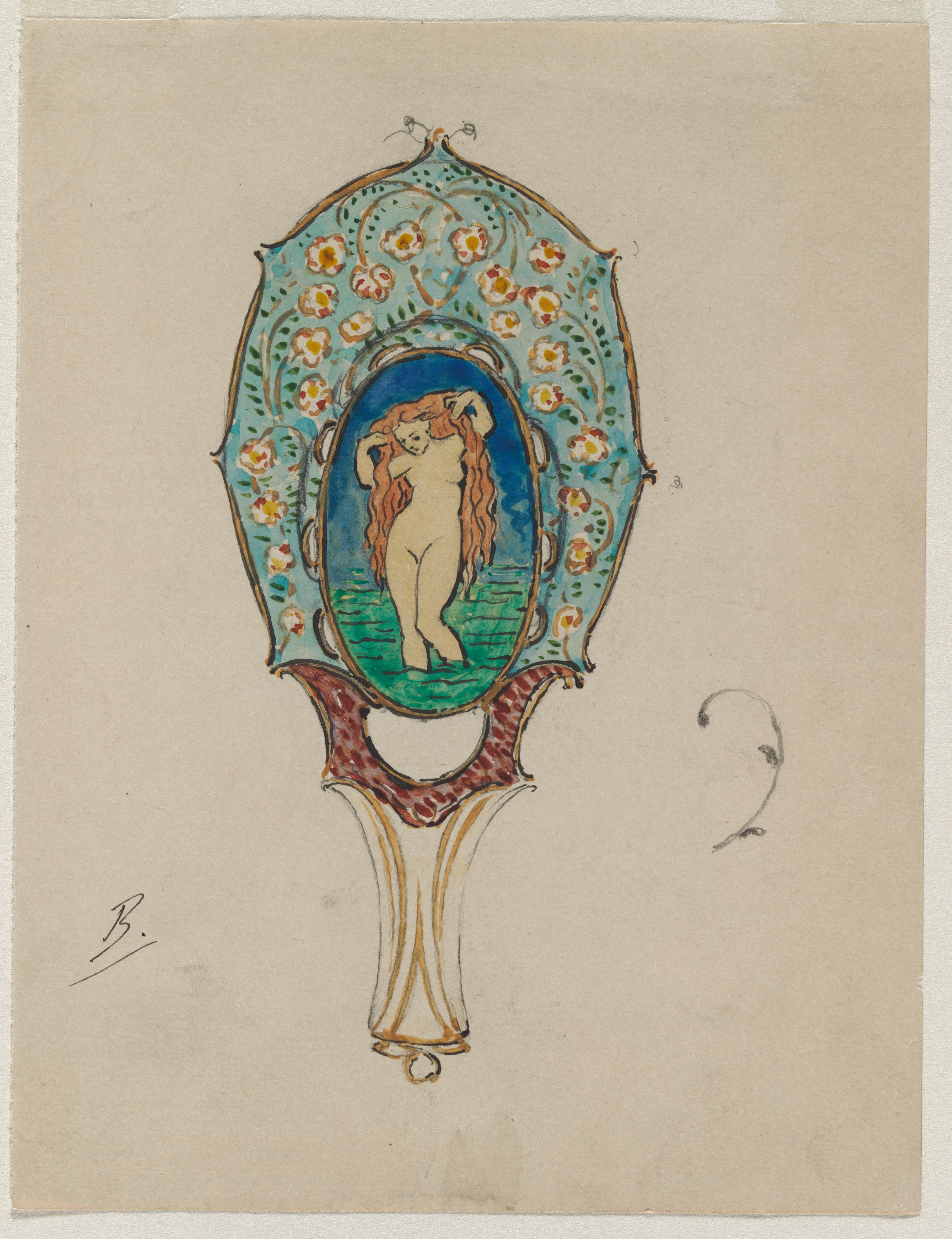 Tan paper with a drawing of a hand mirror. The mirror is irregularly shaped, resembling a leaf, with a blue floral pattern and gold accents around the perimeter. The mirror contains a nude woman with long red hair. Her left hand is raised to her head, and her right hand hangs by her side. She stands on green water. The mirror's handle is brown at the top and fades into gold. A small oval shape sits at the bottom of the handle. A signature is on the bottom left. A scribbled numeral "2" is on the right.