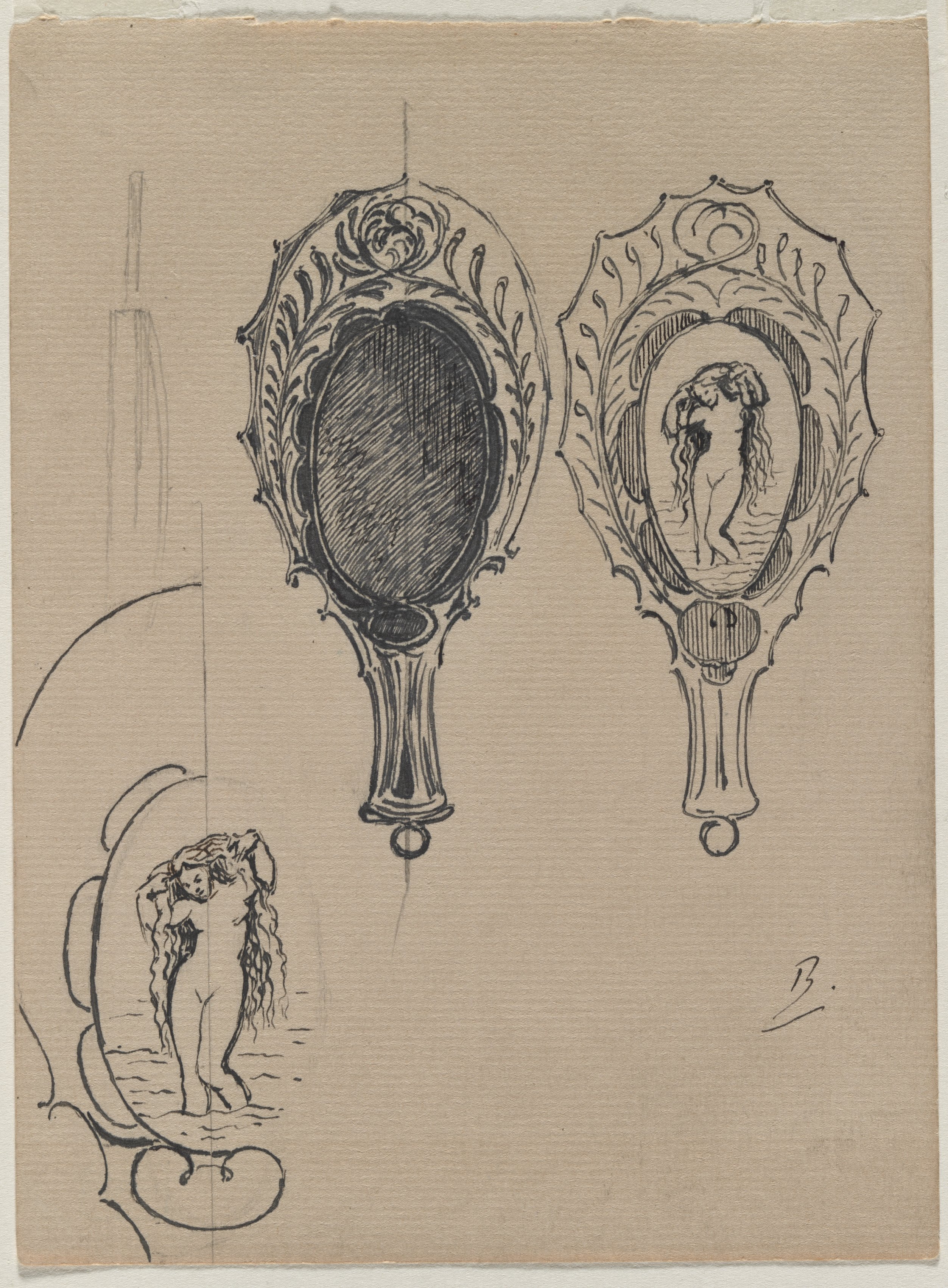 Tan paper with three sketches in black. The left sketch is a partial drawing of a woman with long hair bending over. She stands on a decorative oval surface with curved lines extending behind her. The center sketch shows a vertically shaped hand mirror with a handle ending in a circle. The mirror's frame has a floral design. The mirror has a dark oval reflective surface. The right sketch shows another vertically shaped hand mirror with a handle ending in a circle. The mirror's frame has a floral design. The mirror has an oval reflective surface showing a woman with long hair bending over. The artist's signature appears in the lower right.