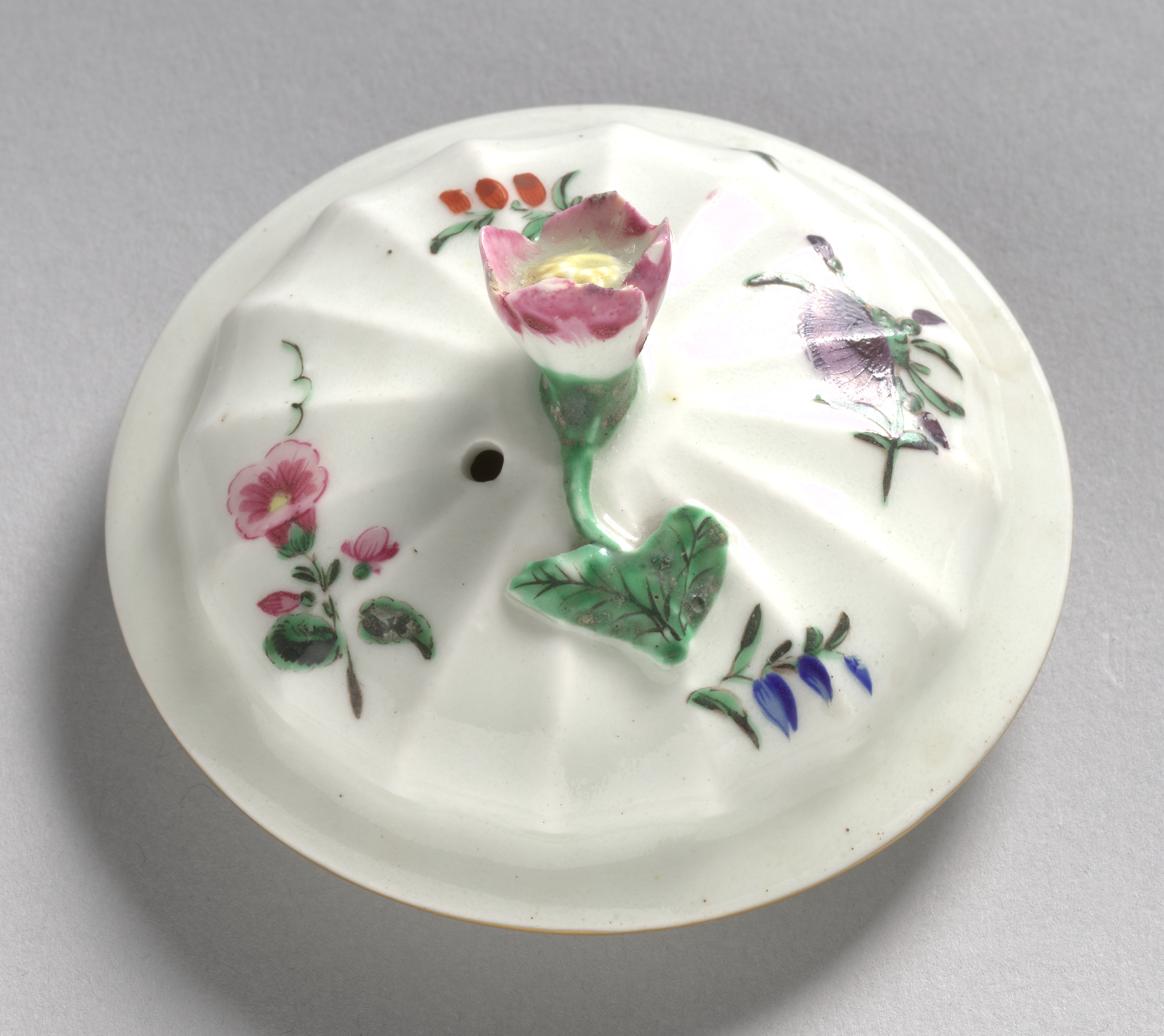 White porcelain lid with a floral design. Round shape, slightly domed. Gold rim around edge. Small hole in center. Various colorful flowers and leaves painted on surface including pink flower with green stem and leaves, purple flower, blue flowers, and pink flowers. Red buds. Green leaves.