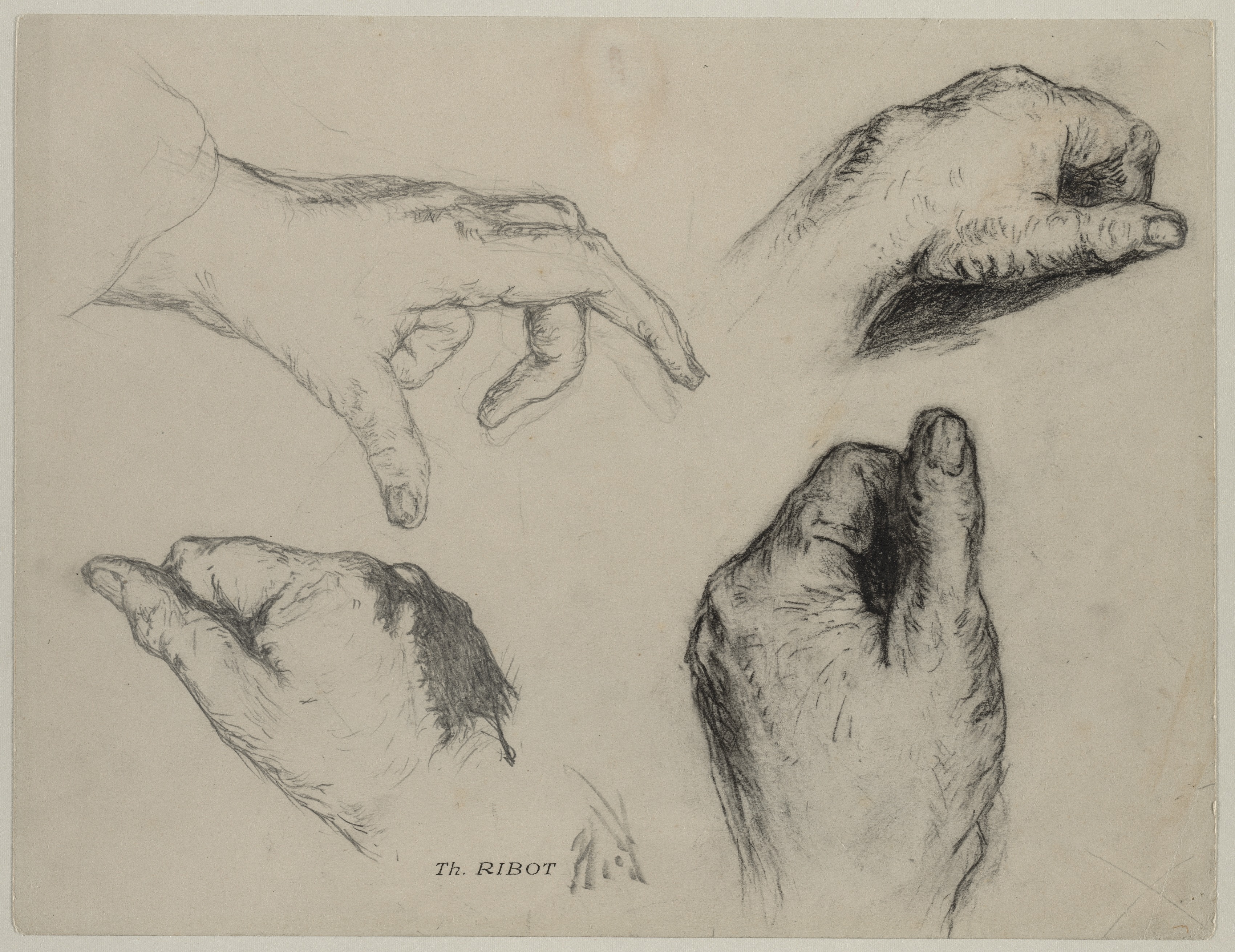 Four pencil drawings of hands on a beige background. Top left: a hand with fingers extended and slightly curled down. Top right: a hand with fingers curled down and to the right. Bottom left: a hand with fingers curled up and to the left. Bottom right: a thumb pointing up with other fingers curled down. The artist's name is written in small letters at the bottom center.