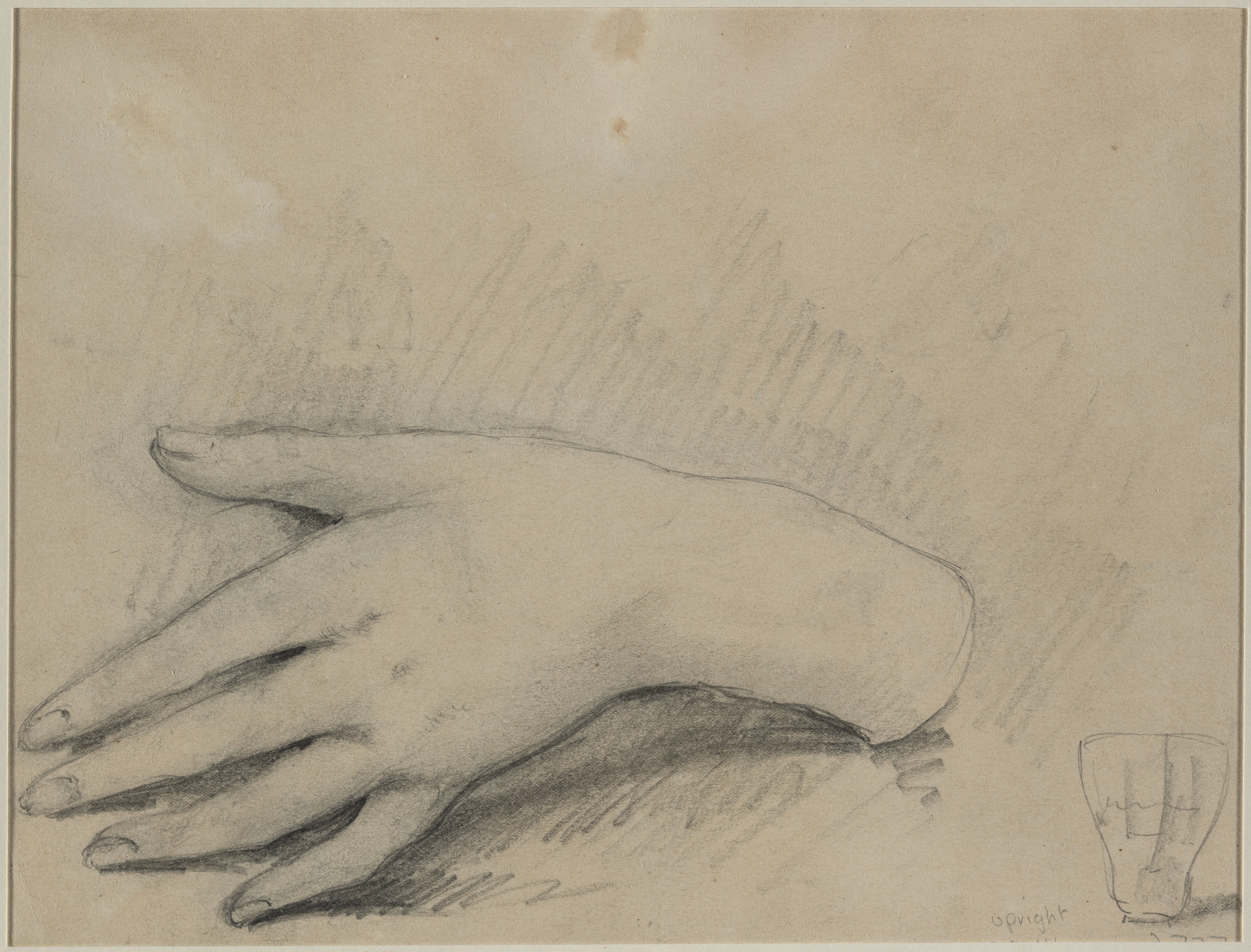 A pencil drawing of a left hand turned palm down, on a flat surface, with a small glass or cup drawn in the lower right. The hand, extending from the left side, is shaded with more detail on the fingers, and lightly sketched on the wrist and arm. The background is lightly shaded. Stains are on the upper background.