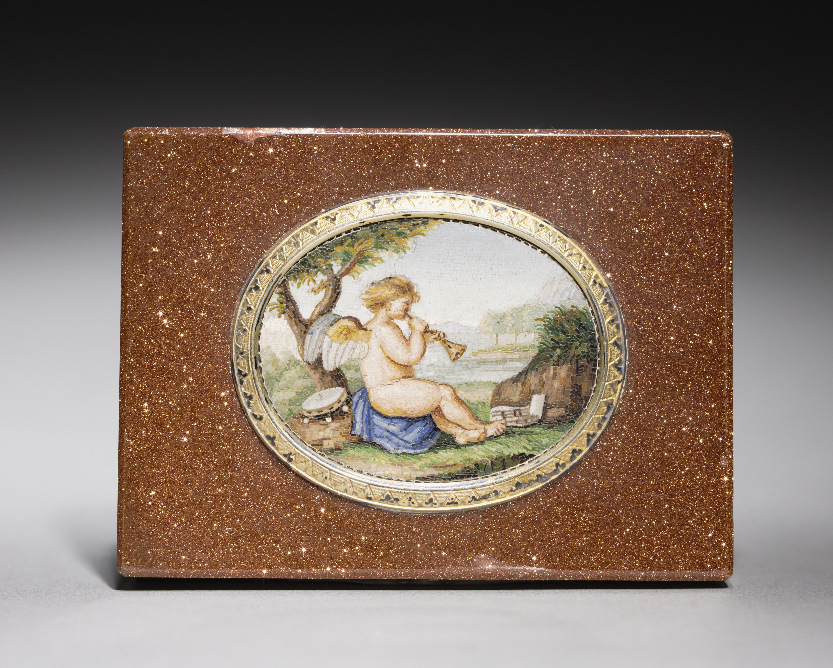The image depicts a square object known as "Snuff Box" by artist unknown. The object, a snuff box, has a brown background with gold speckles. In the center is a circular image framed in gold. Inside the circular image is a cherub playing a trumpet. The cherub sits on a blue cloth, with wing on its back, under a tree. The cherub has a drum on the left beside it. The background of the circular image shows grass and stone steps leading to water with a town on the horizon. The object sits on a grey surface and a black to grey gradient fills the background.