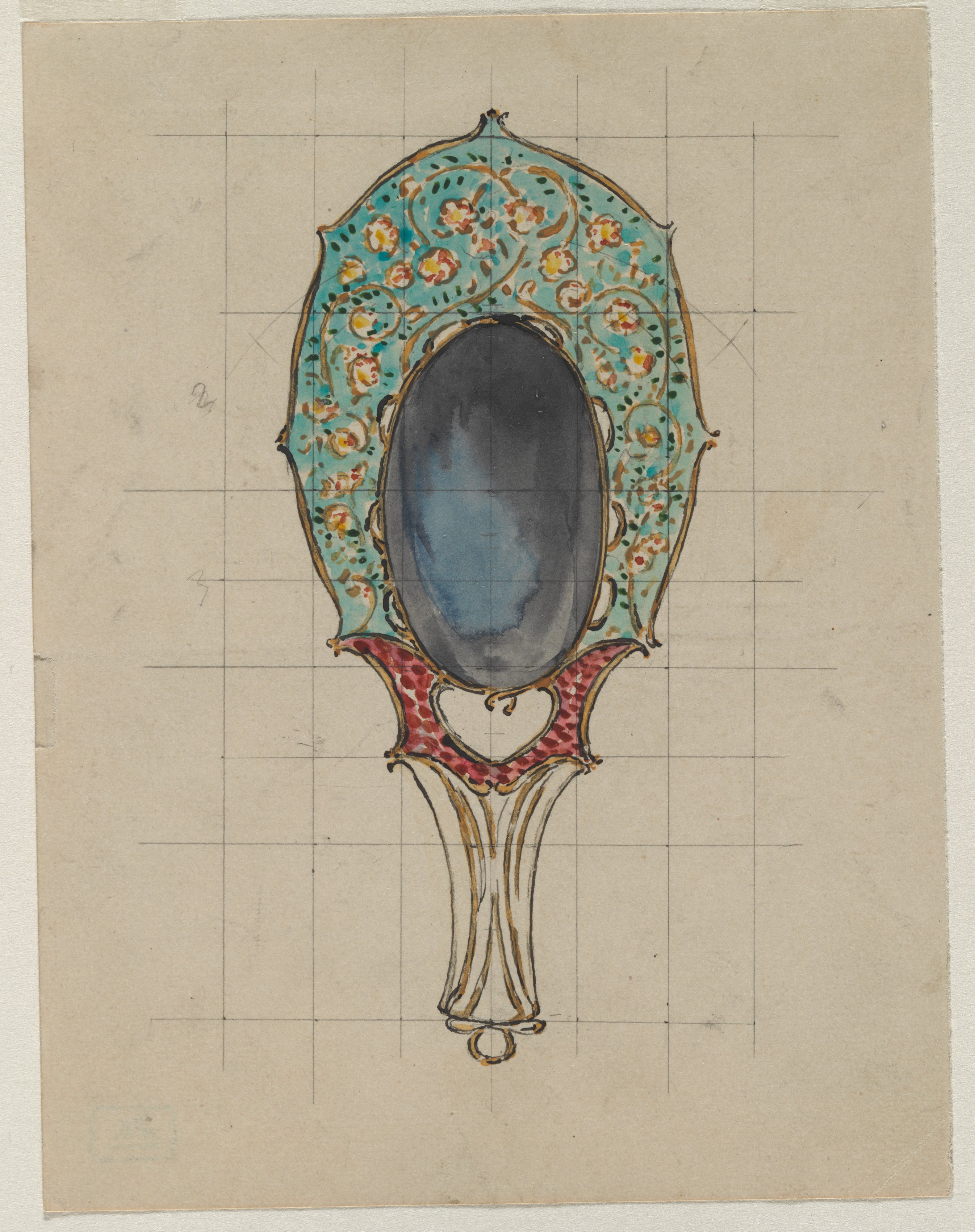 Beige paper with grid lines. A hand mirror design with a turquoise top with floral designs in shades of orange and pink. Dark grey mirror. Red and white handle.