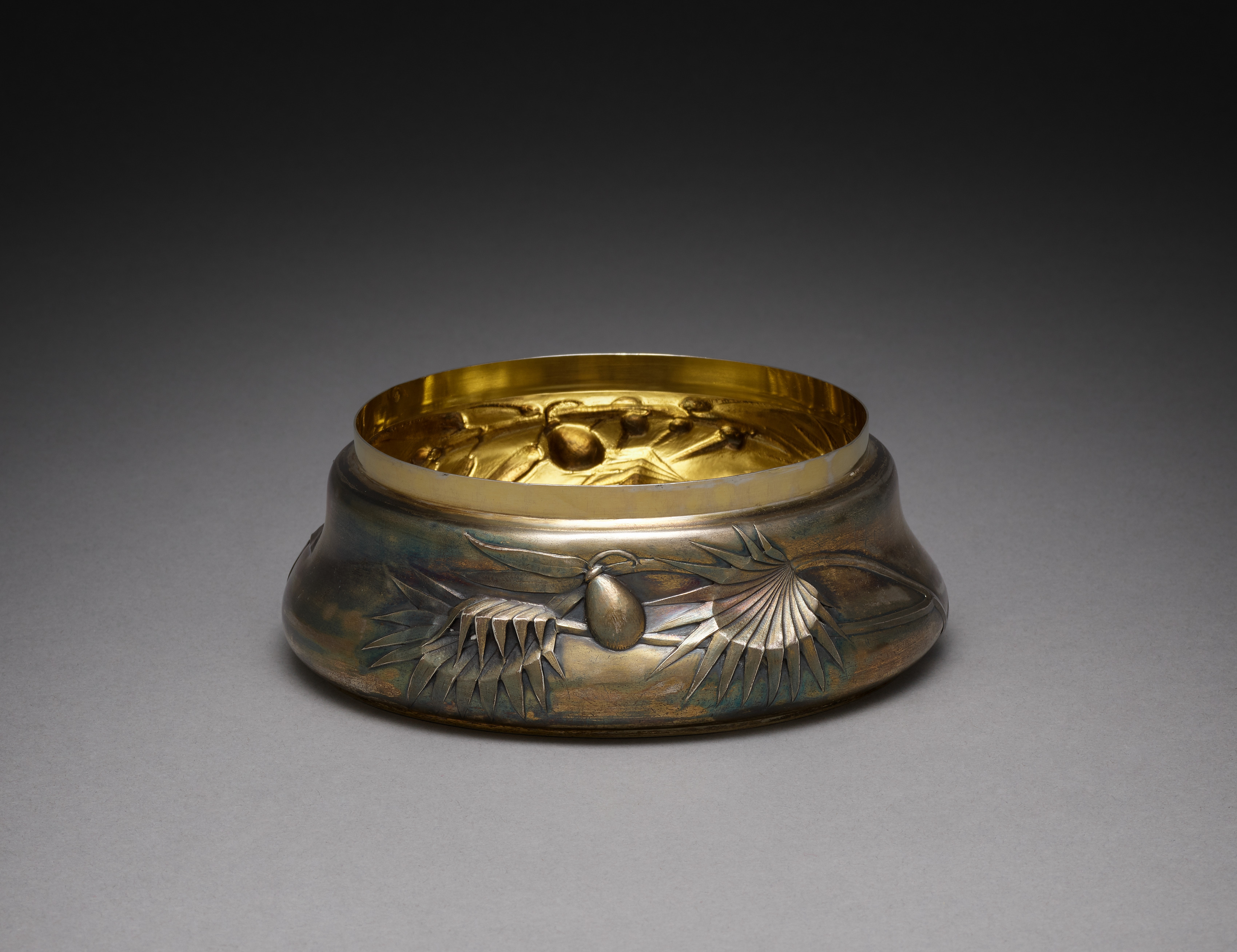 The object is a low, wide container with a wide mouth. The outside of the container is bronze-colored with a dark patina. The outside has an embossed design around the middle with palm-like leaves and a teardrop-shaped object. The inside of the container is shiny gold-colored. The background is gray and darkens towards the top. The object is titled "Box" and was created by Ingeborg Plockross-Iminger.
