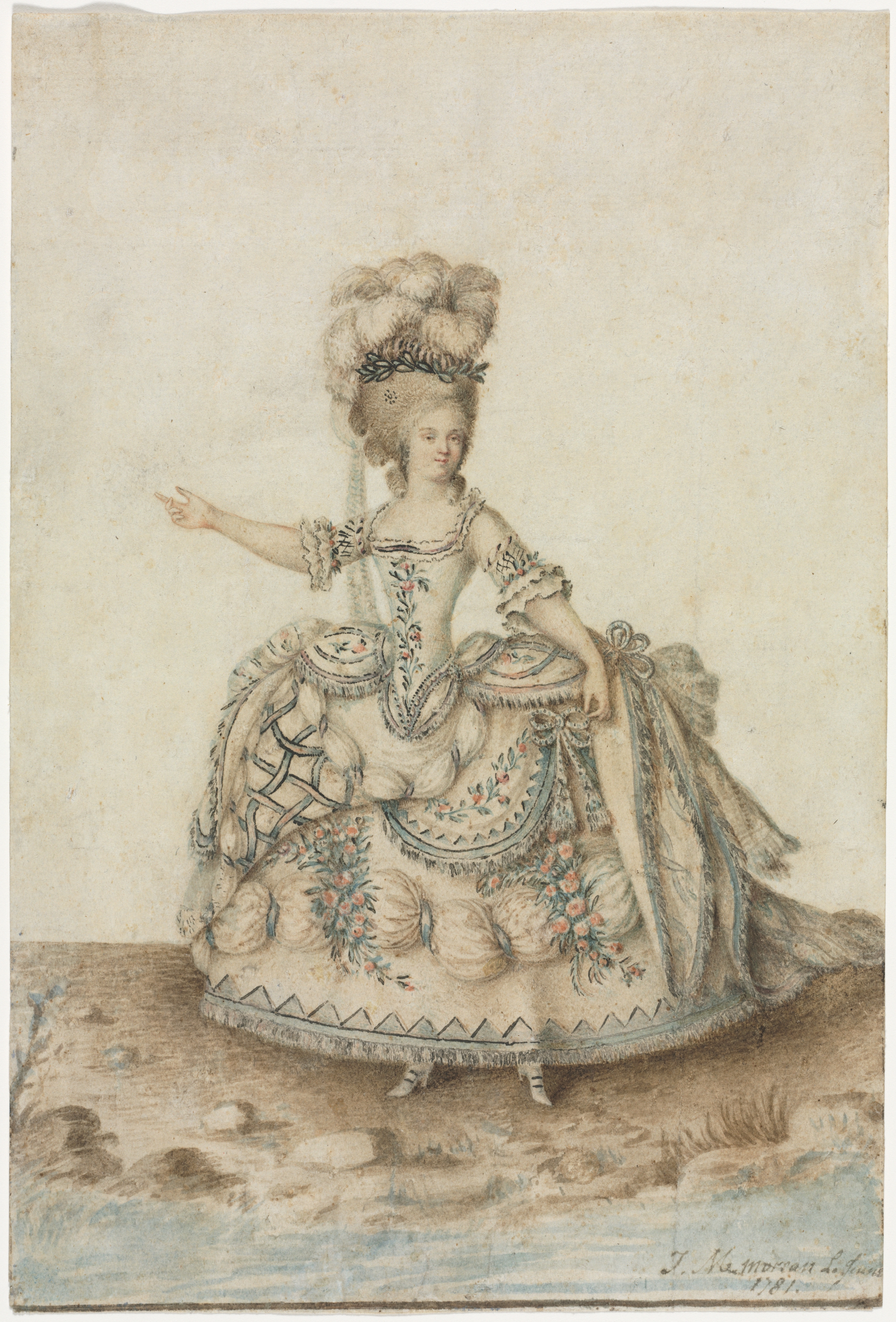 The drawing depicts a woman wearing an elaborate dress and hairstyle. The woman's dress is full and flared, with a fitted bodice and a large skirt. The dress features a floral pattern with pink flowers and green leaves. It has short, frilly sleeves and a low neckline. A decorative panel on the bodice features pink flowers and green leaves. The skirt is adorned with tassels along the bottom edge. The woman's hair is styled in an elaborate updo, adorned with a green wreath. Her right arm is extended outward, while her left arm is bent at the elbow. The background of the drawing is a plain, off-white color, with a brown floor and blue water at the bottom. The artist's signature is visible in the bottom-right corner.