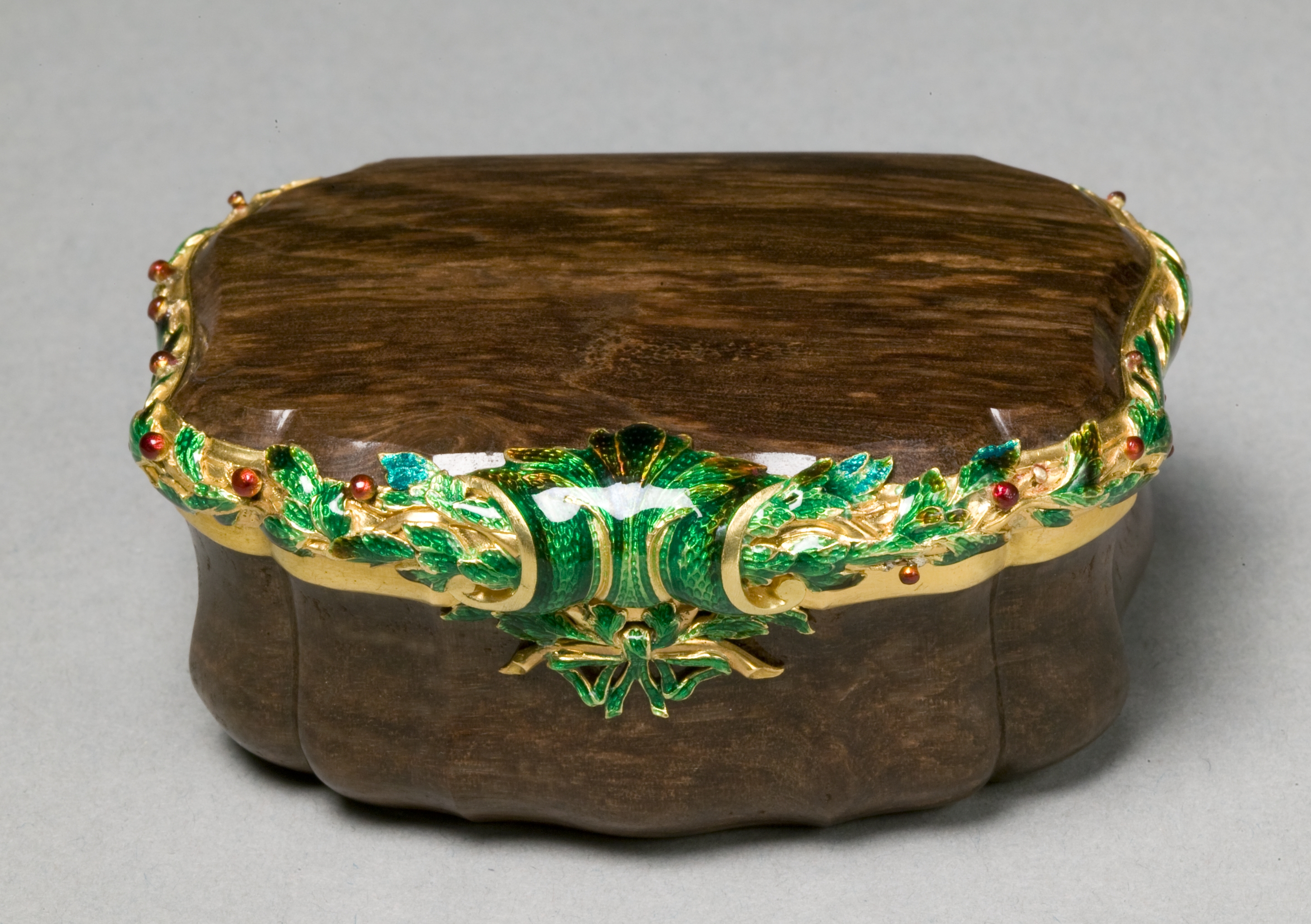 The image depicts a Snuff Box by Peter Carl Fabergé. The box is dark brown with a rounded rectangular shape and a flat top. A gold band encircles the box, featuring green enamel leaves and red beads. The gold band has a decorative design in the center, with a white accent. The box sits on a gray surface, casting a shadow to the right.