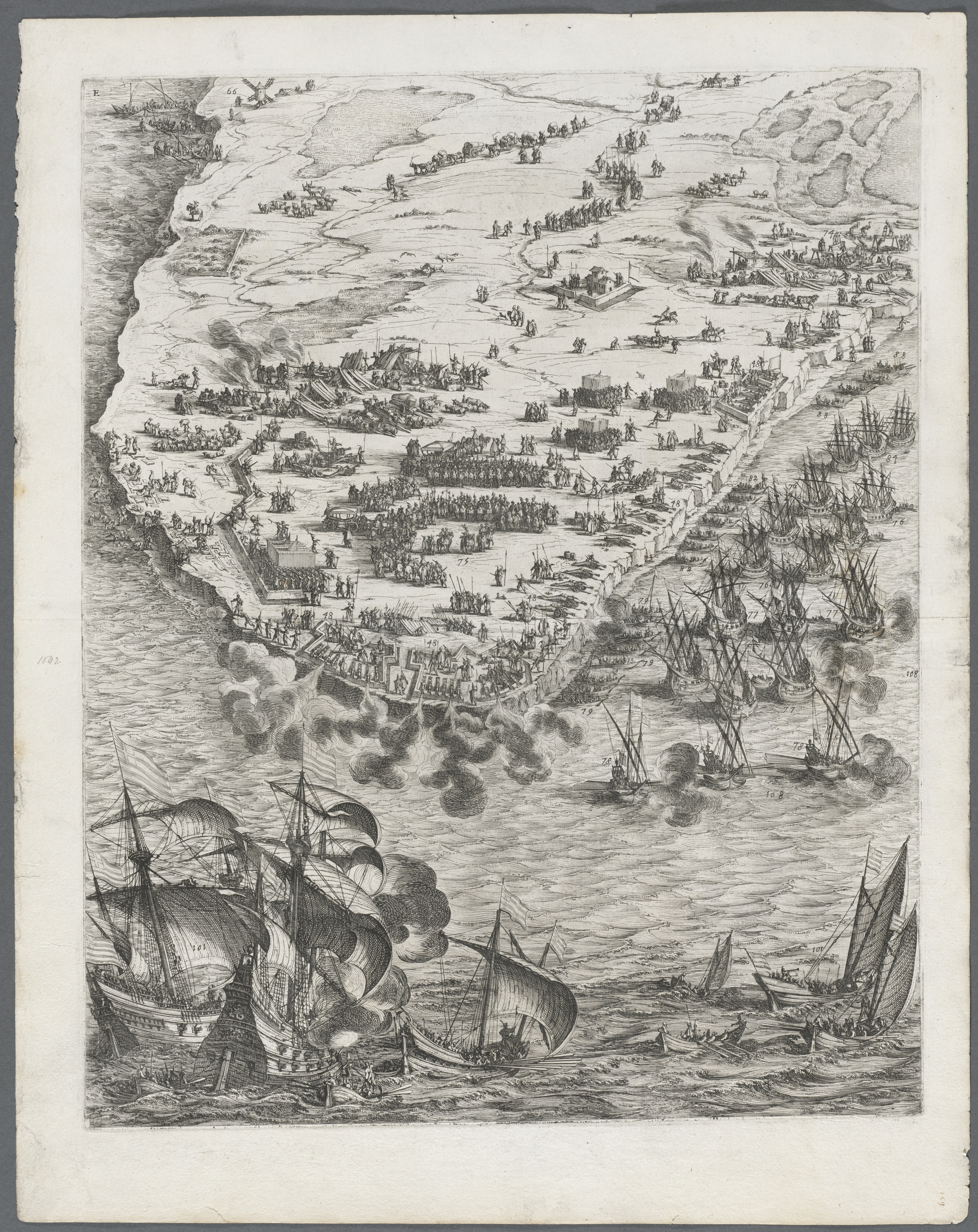 The Siege of La Rochelle: Plate 10 by Jacques Callot. Black and white etching of a coastal city under siege. The city occupies the top half of the image, with a coastline on the left and the sea on the right. Ships are in the water along the bottom and right sides of the image. The city has a wall along the coastline with people standing on it. There are many people and buildings within the city. Smoke billows from the city and ships. The sea is choppy with waves. The image has a rough, aged appearance with a thick white border around it. The border is rough around the edges. The image is oriented vertically. The overall scene depicts a busy and chaotic coastal city under attack.
