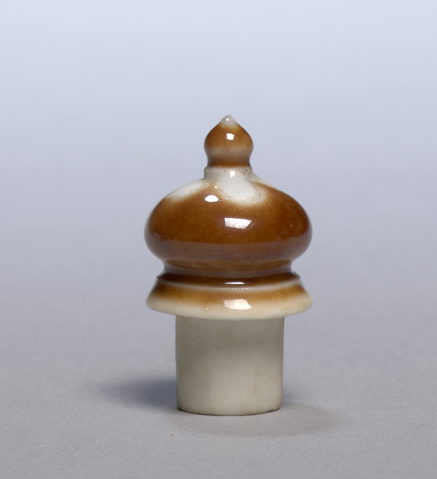 Small ceramic object with a cylindrical base, rounded top with a small point. The base is white, the top brown and white.