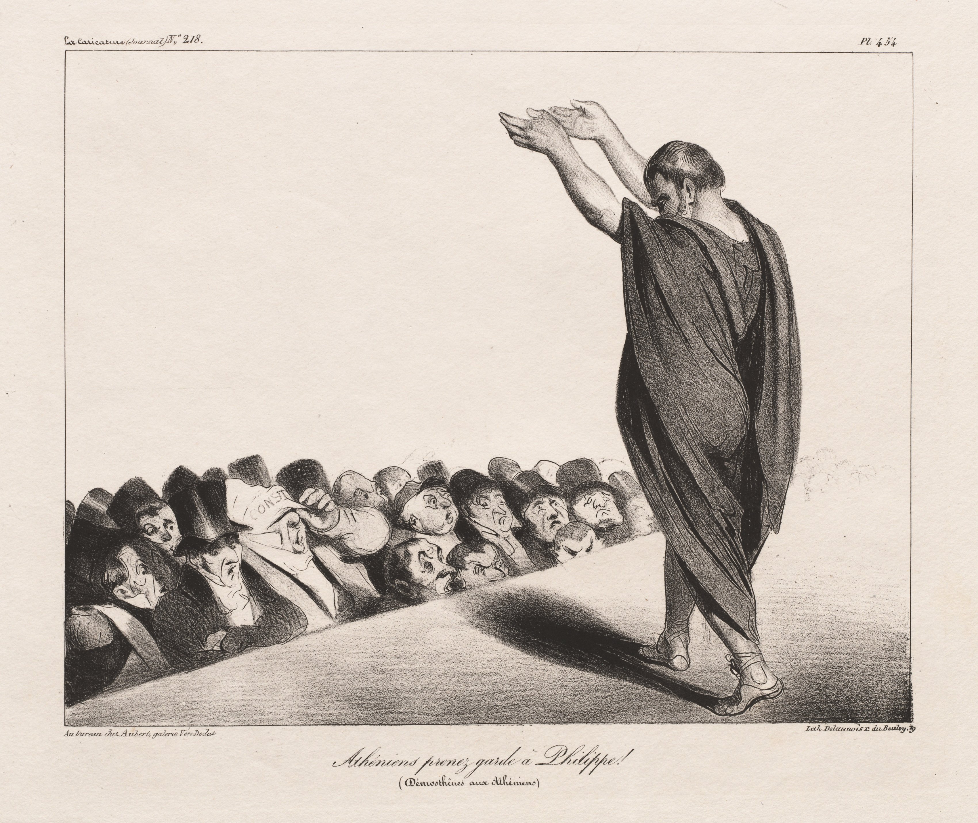 Black and white drawing of a man in a draped garment gesturing with both hands to an audience. The man is standing on a platform or stage, facing away from the viewer, to the left. He has short hair and is wearing a dark-colored garment draped over his left shoulder and around his body. His arms are raised with the palms facing down. He is wearing sandals. The audience is seated on the left side, visible from the chest up. They are wearing 19th-century-style top hats and formal clothing. The audience members have varied expressions, some appearing concerned or frightened. The background is plain and light-colored. The image has a thin black border and small text at the bottom.