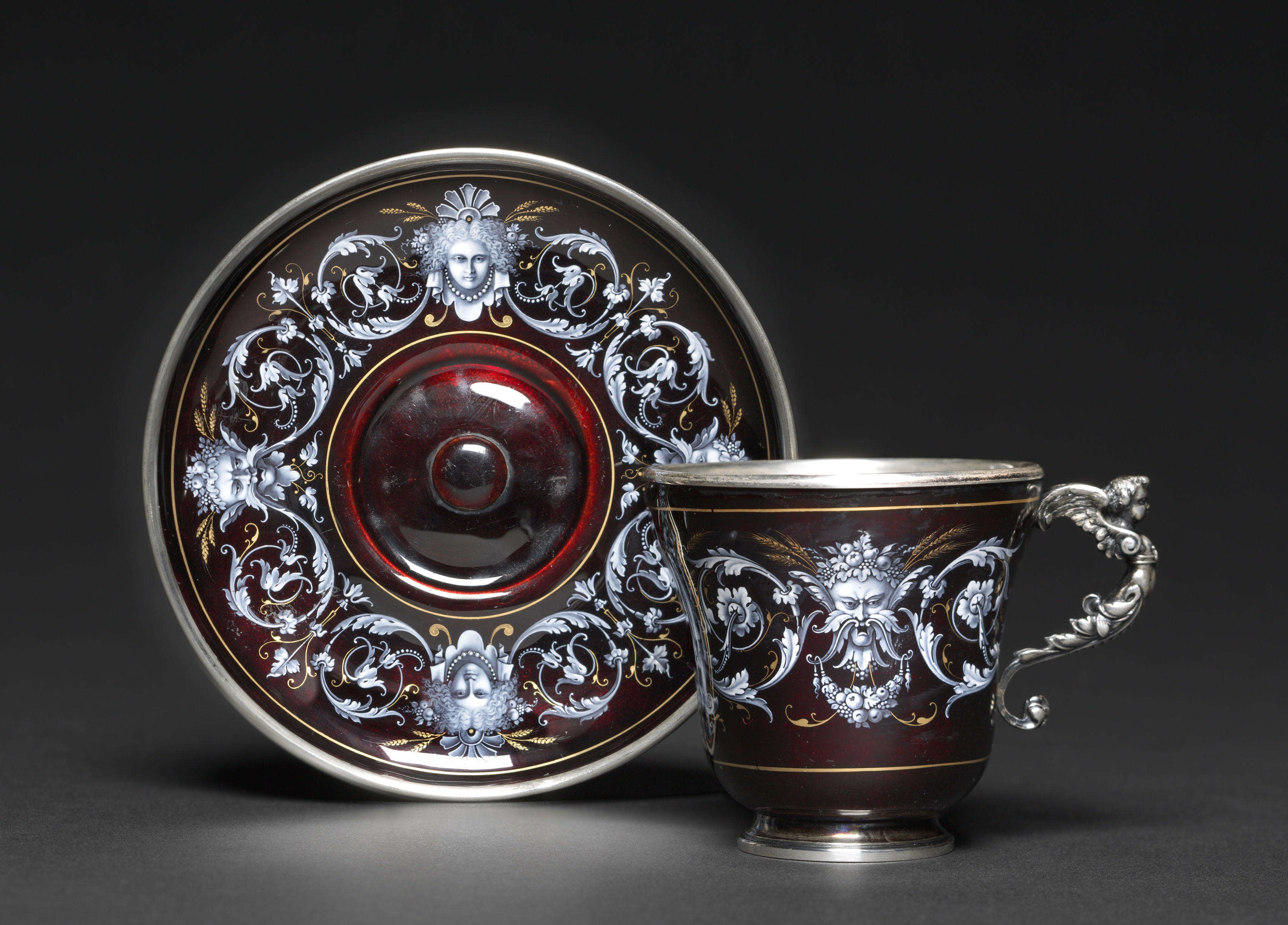 The image depicts a cup and saucer titled "Cup and Saucer" by artist Boch. The saucer is round with a dark red center and gold trim with a silver rim. The center has a circular indentation. The saucer's main body features a dark background with white and gold designs, including faces and floral patterns. The cup is positioned in front of the saucer to the right, with a dark red body and silver rim and base. It has a handle on the right side featuring a winged figure. The cup's body also features a dark background with white and gold designs, including faces and floral patterns, similar to the saucer. The background of the image is dark gray.