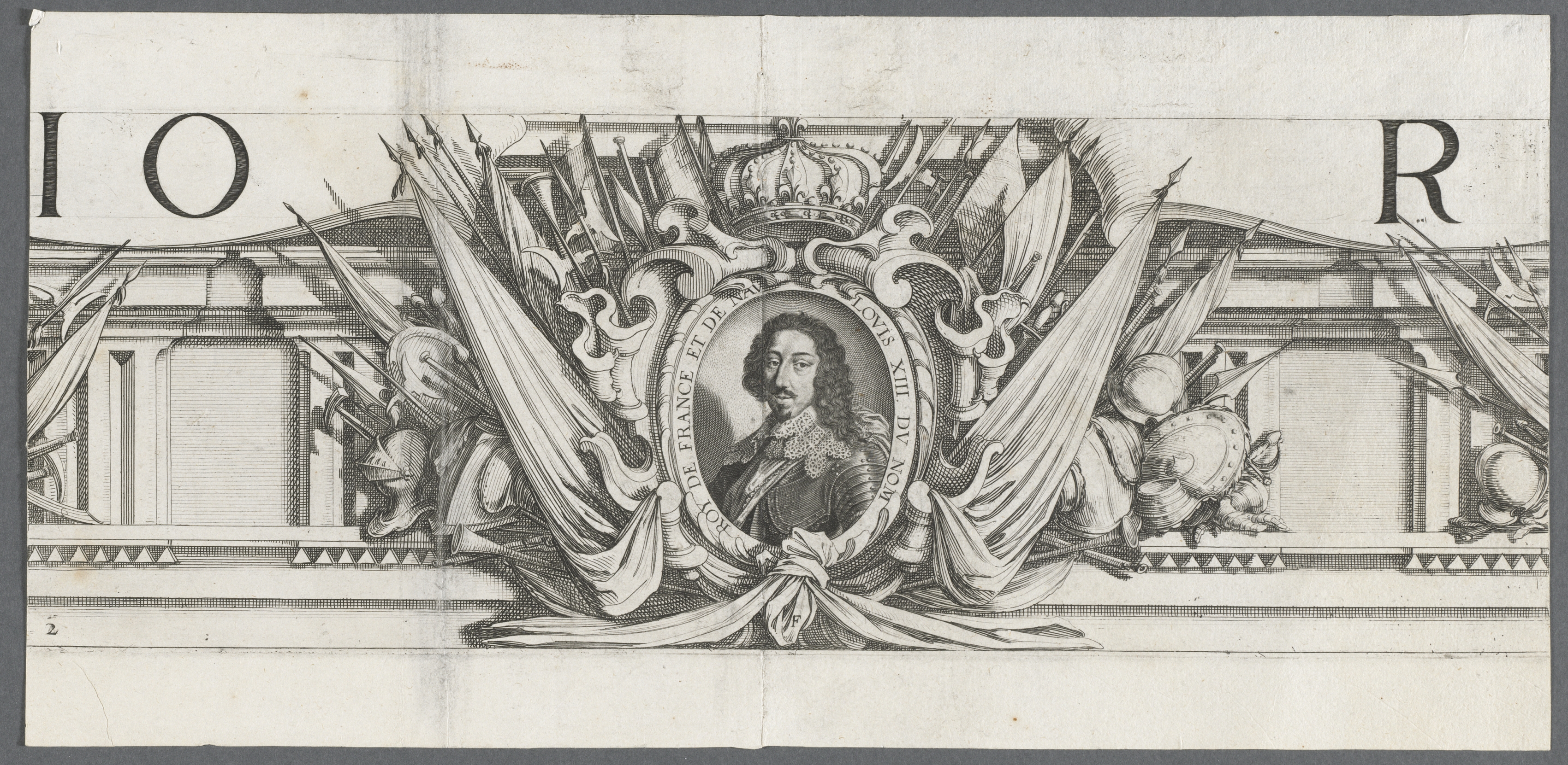 The Siege of La Rochelle: Plate 2 by Michael Lasne. Black and white image on off-white background. An ornate frame contains a portrait of a man with long, curly hair. He wears a lace collar and a crown sits above the frame. A ribbon wraps around the frame with text in Latin. The frame is decorated with leaves, flags, and fabric. Two columns are on either side. The letters "I", "O", and "R" are printed. A crown sits atop the frame. Flags and fabric drape around the frame. The number "2" is printed in the bottom-left corner.