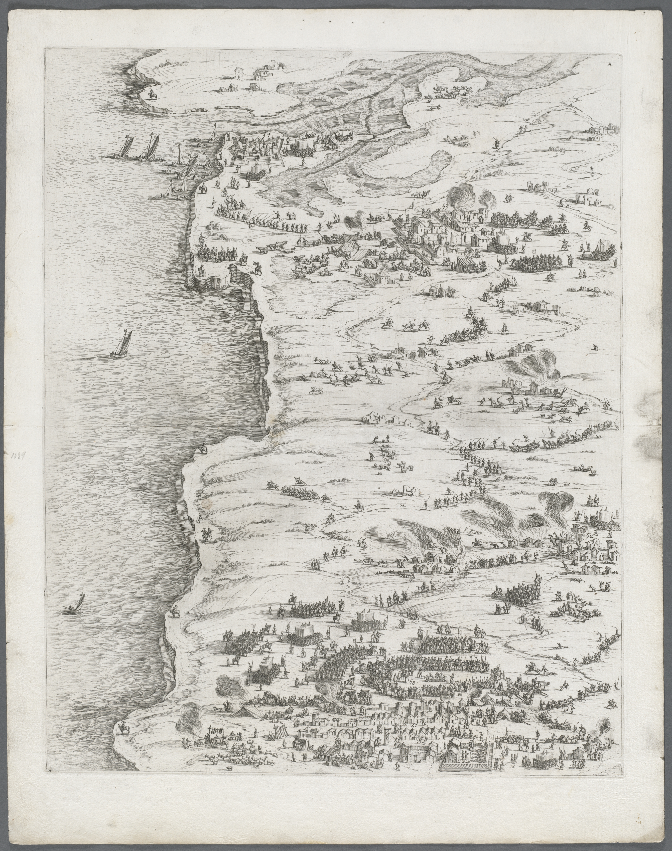 Black and white illustration on aged paper. A coastline on the left with small waves at the shoreline. Small ships scattered on water. Landmass on the right with buildings, roads, and groups of people. The illustration depicts a siege with smoke rising from fires and cannons. The scene portrays a large military encampment.