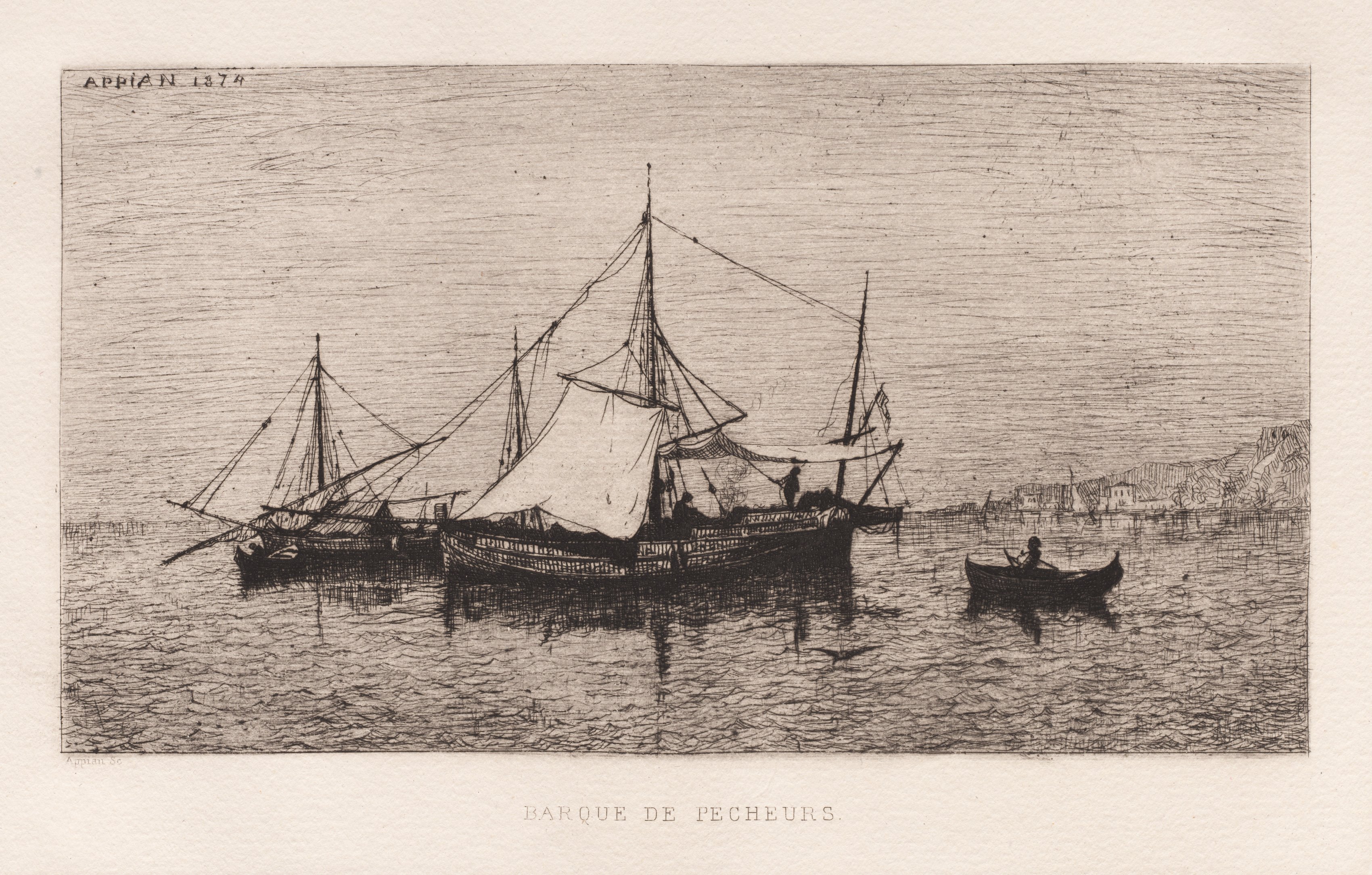 Black and white drawing of three boats on a body of water. The largest boat is in the center, with a large sail partially unfurled and rigging with ropes and nets. The boat on the left has two masts. The boat on the right is small with one person rowing. The water is rippled. The background shows land on the right with buildings. The sky takes up most of the image and is featureless. The image has a border with text at the bottom center that reads "BARQUE DE PECHEURS". The top left corner of the image has the text "APPIAN 1874".
