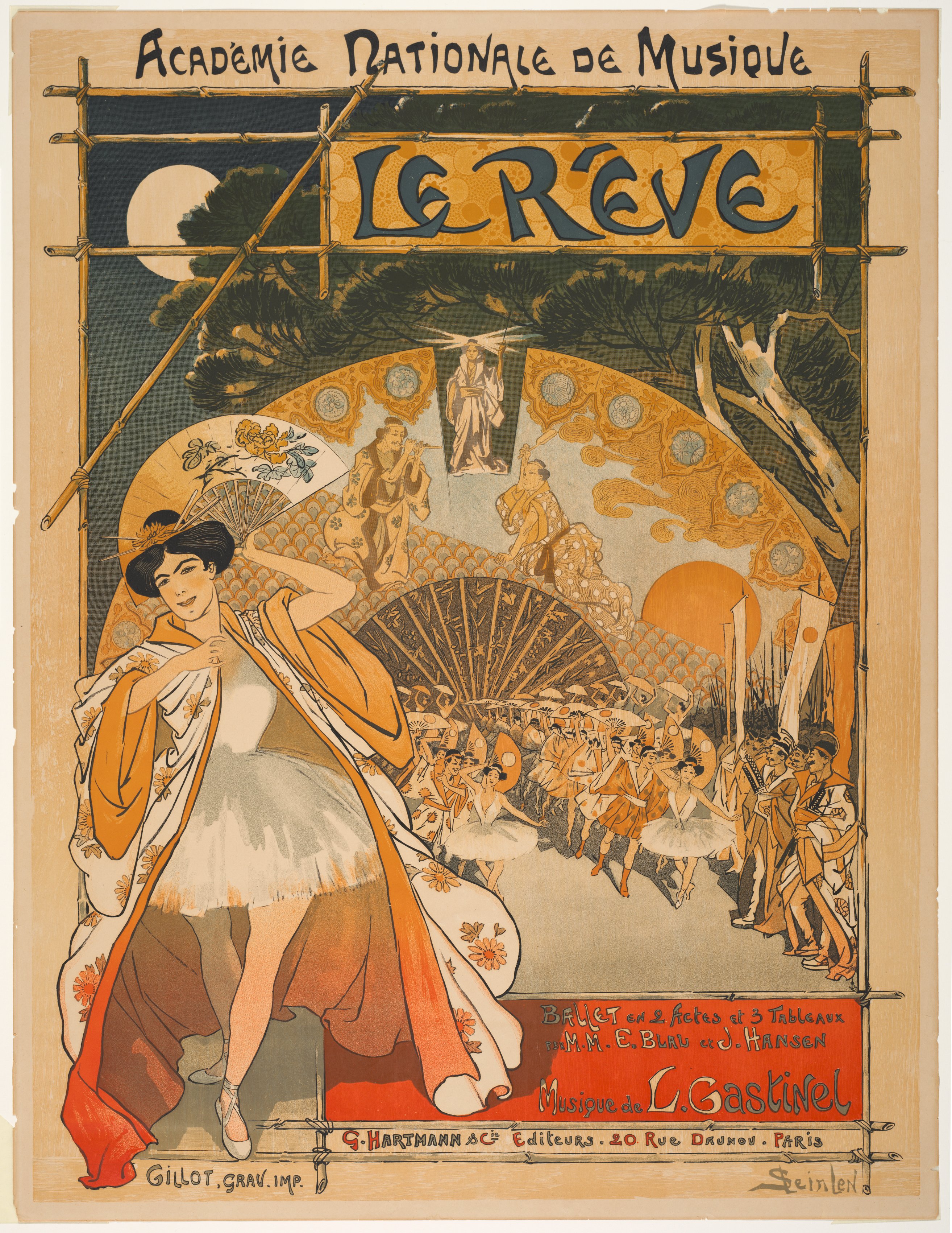 The poster features a woman in a white dress and orange kimono. She has black hair and holds a fan. A crowd of people in various costumes is behind her. A large moon is in the top left corner. A tree and a sign with "Le Reve" are above the crowd. The background is a mix of orange, yellow, and black.