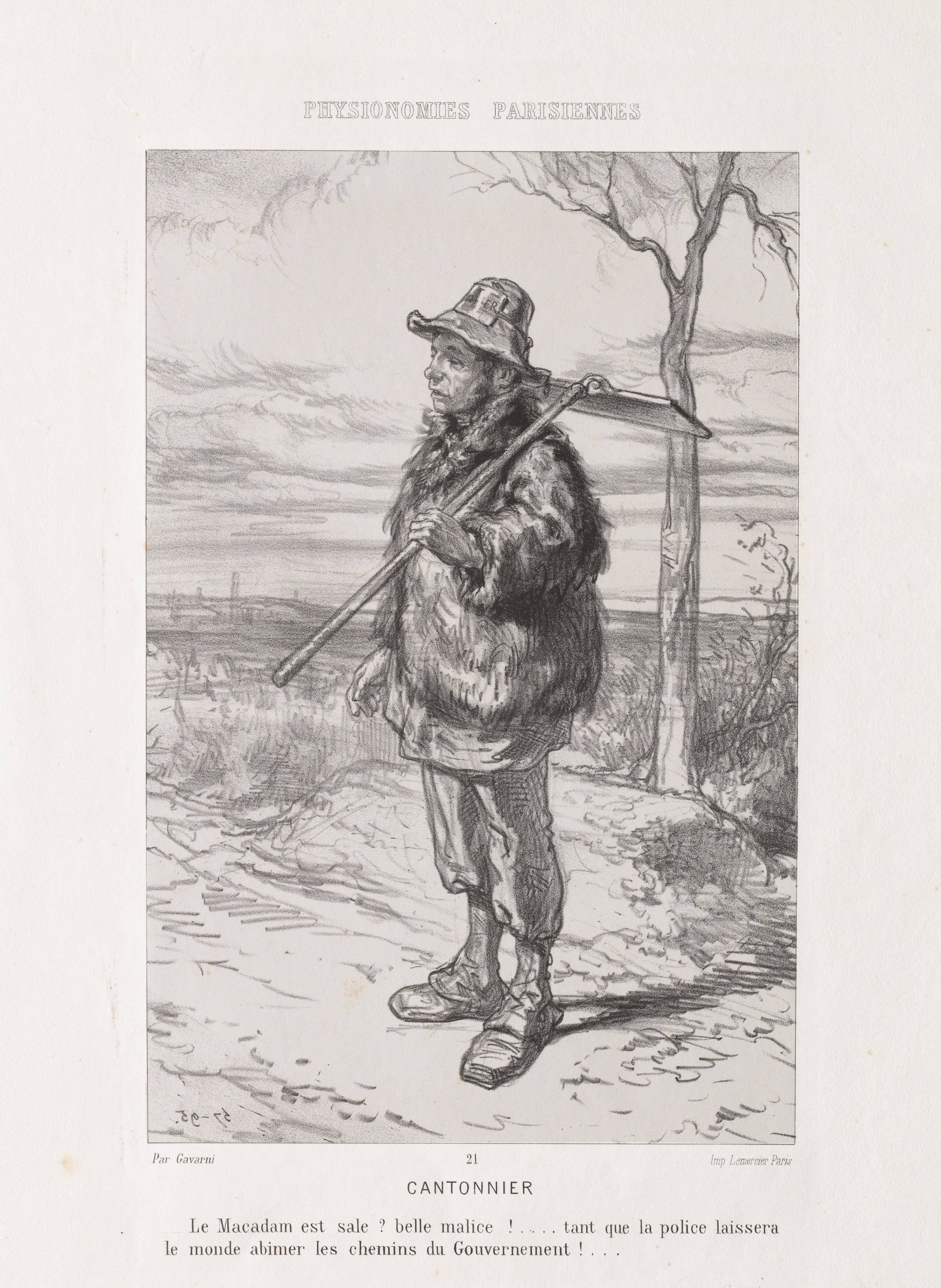 Black and white drawing of a man wearing a hat, a furry jacket and pants, and shoes with a long stick over his right shoulder. A tree without leaves is on the right side. The man is standing on a dirt path. The background appears to be a landscape with a cloudy sky. The text at the top reads "PHYSIONOMIES PARISIENNES". Below the drawing, the text reads "CANTONNIER".