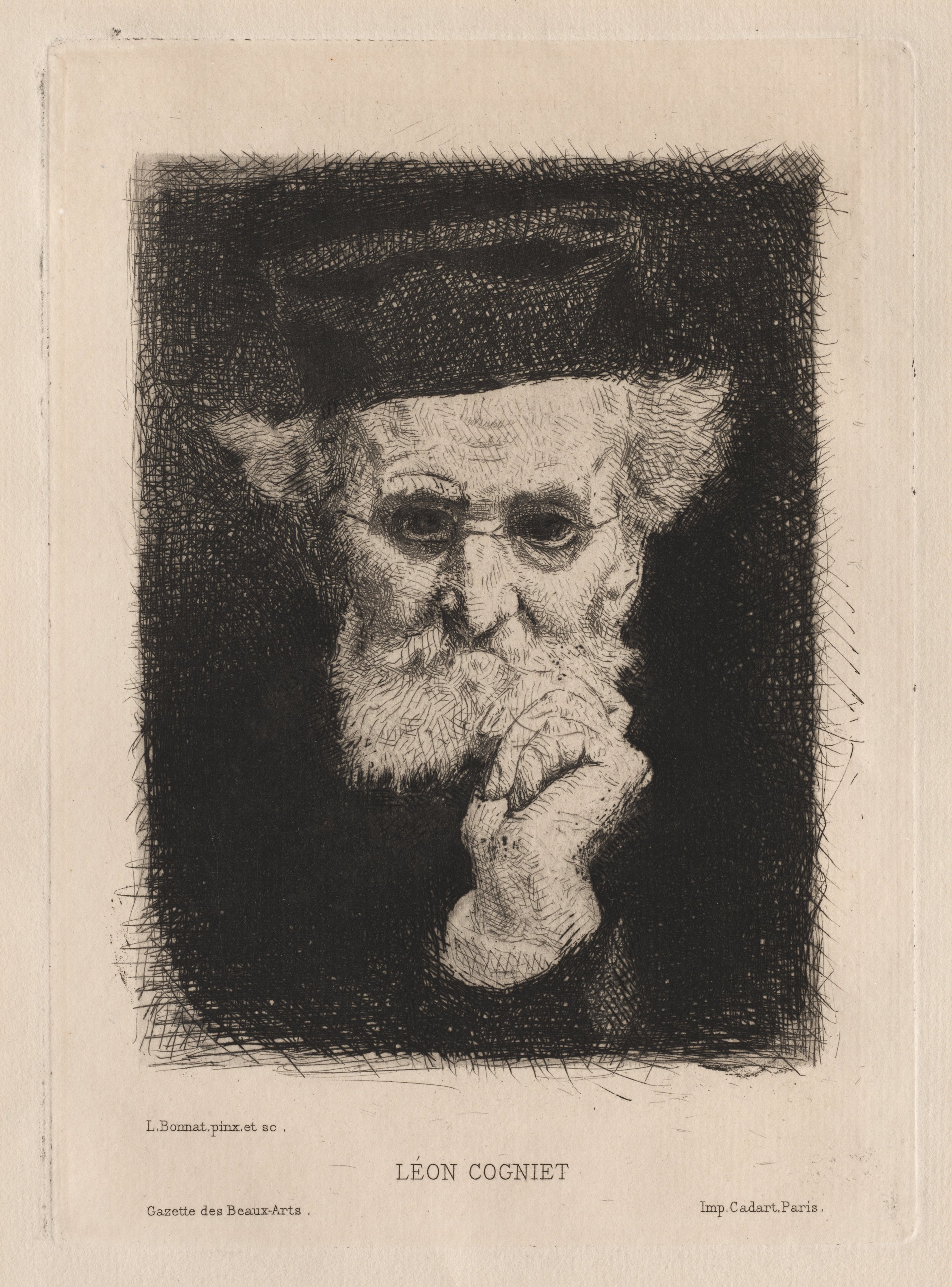 Black and white sketch of a white man with white hair and a white beard; he wears a dark hat and has his hand under his chin.
