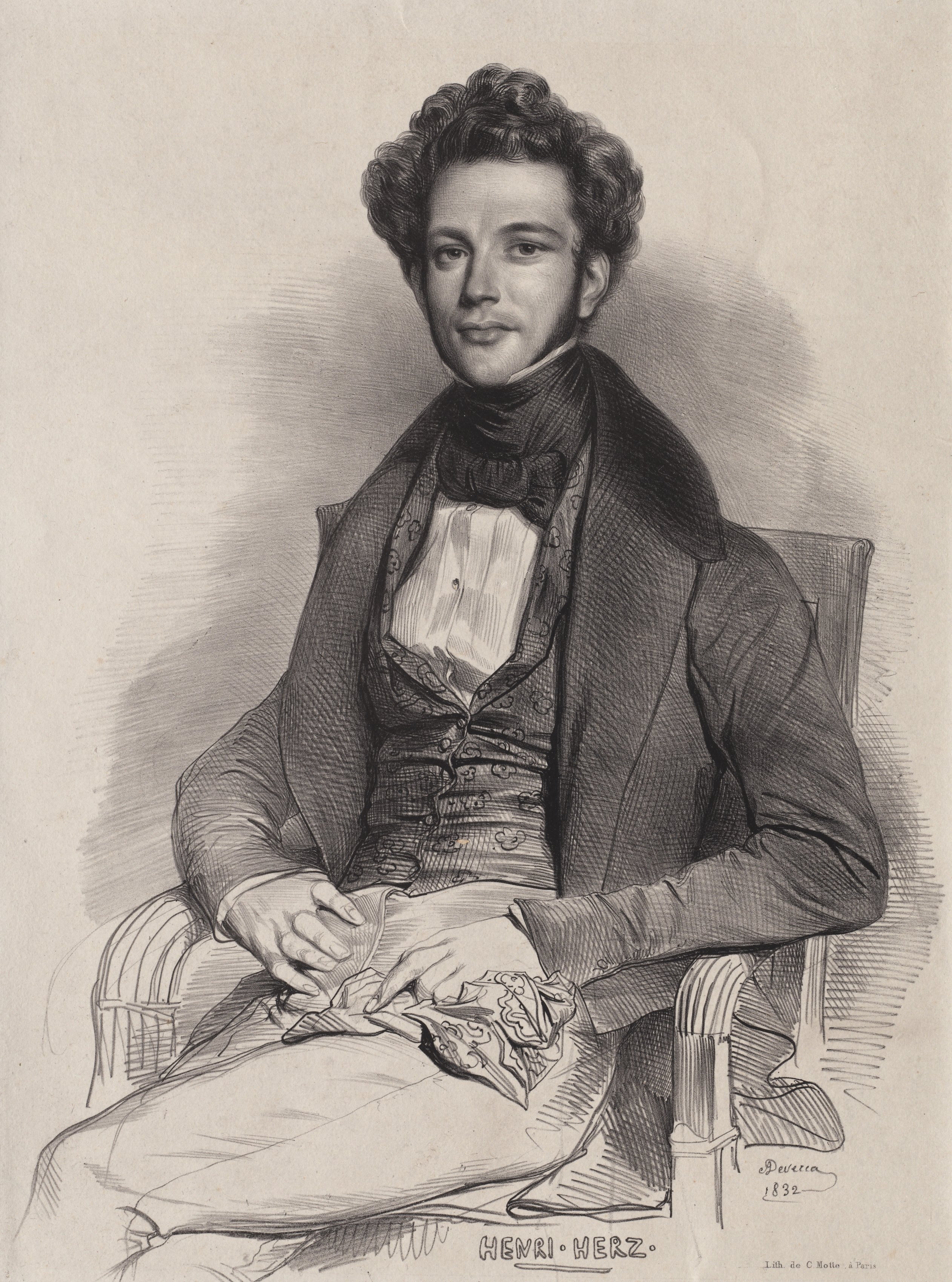 Black and white drawing of a man sitting in a chair, with hands resting on lap. He wears a jacket with wide lapels over a vest and a silk scarf looped around his neck. His curly hair is dark. His pants are light colored. He sits on a chair with curved legs. Text at the bottom center reads "HENRI HERZ". Text to the right reads "Devéria 1832".