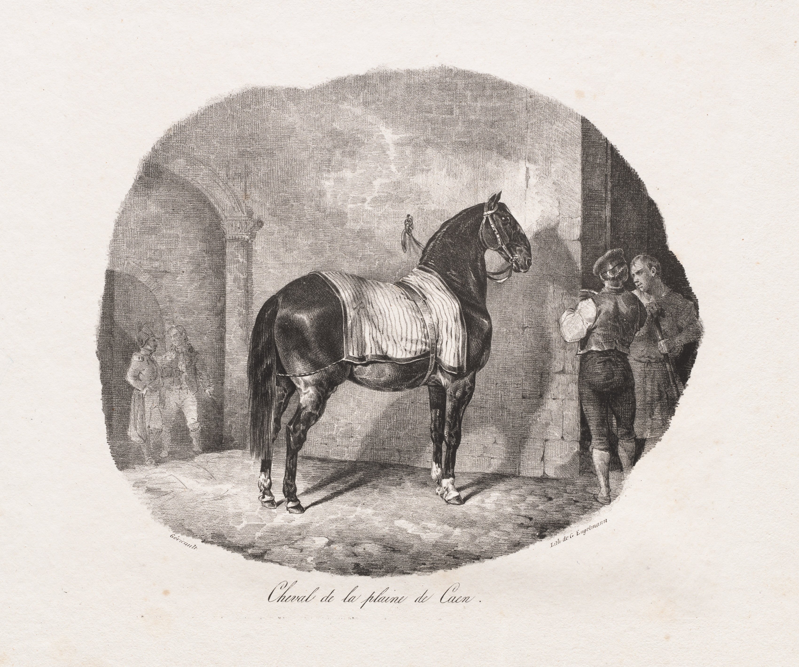 Black and white lithograph of a horse in a courtyard. The horse stands in the center, facing right. The horse is dark with a white patch on its forehead and white on all four lower legs. The horse wears a bridle and a blanket with stripes. The courtyard has an arched stone entrance on the left and two men are standing under it. To the right of the horse are two men talking. The image is circular with a white background. The text at the bottom reads "Cheval de la plaine de Caen".