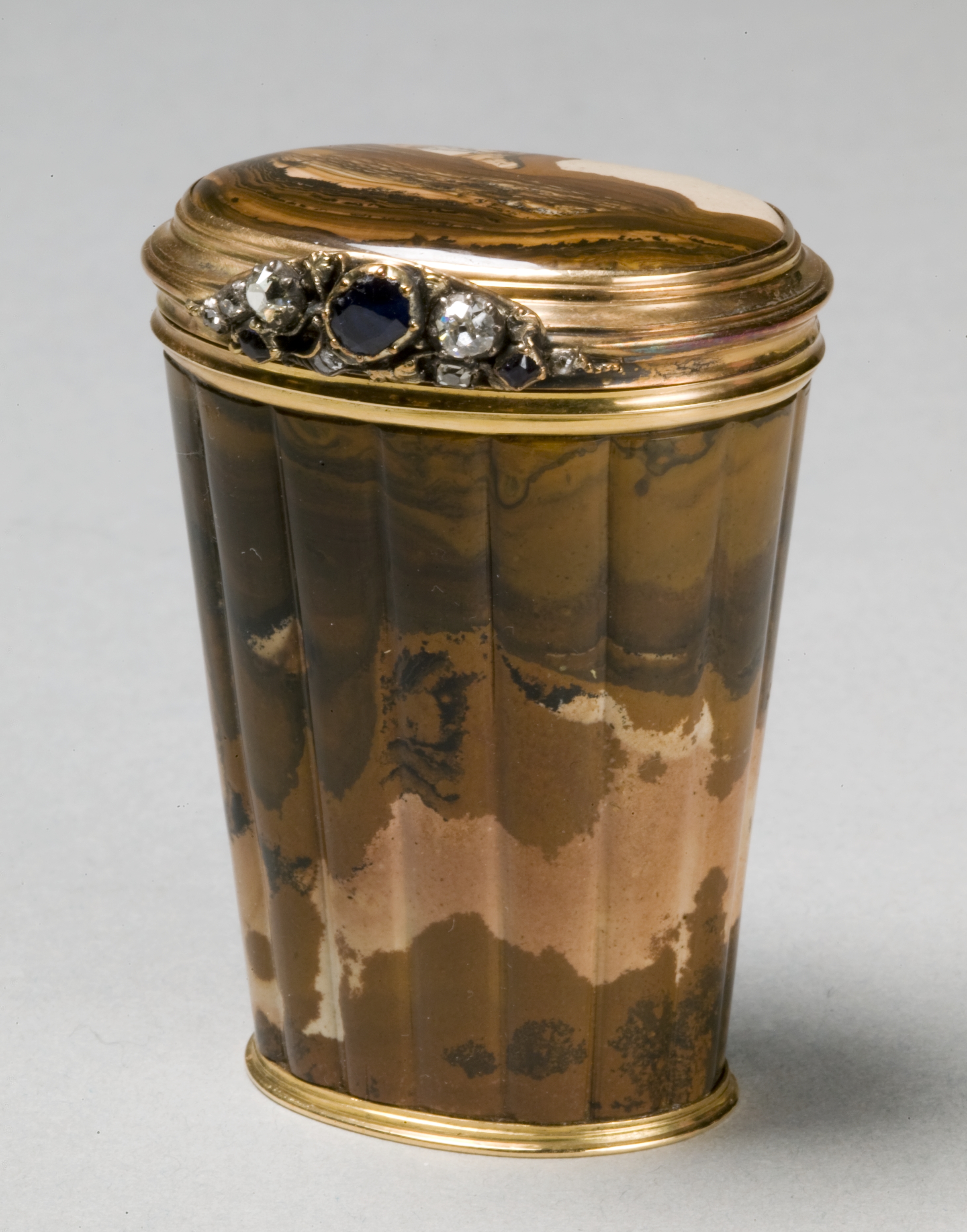 Snuff Box by George III: A cylindrical, brown and gold-colored snuff box with a domed lid. The box features a fluted design and a gold base and trim. The lid is adorned with a decorative gold and gemstone design, including a large blue gemstone flanked by smaller clear gemstones. The box's surface exhibits a marbled or mottled appearance, with shades of brown and gold. The background is a plain gray color.