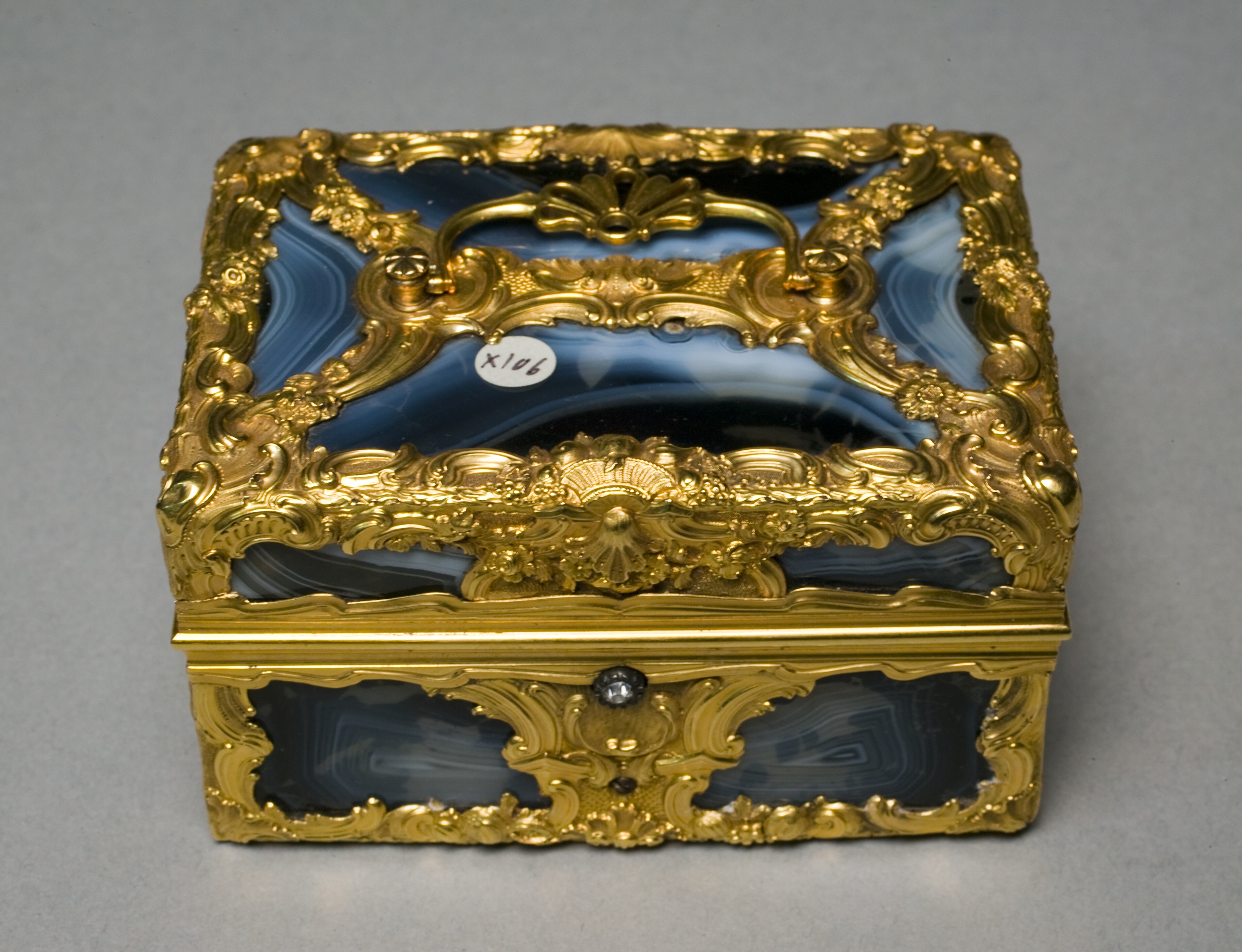 The Vanity Case (Nécessaire) is a small, square-shaped box with a gold-colored metal frame. The frame features intricate designs and patterns, including floral motifs and scrollwork. The box has a hinged lid that opens to reveal a compartment inside. The box has blue and white marbled glass or stone inserts on the top and sides, which add a decorative touch. A small, round sticker with the number "X106" is affixed to the top of the box. The box sits on a plain gray surface, providing a neutral background that allows the ornate details of the box to take center stage.