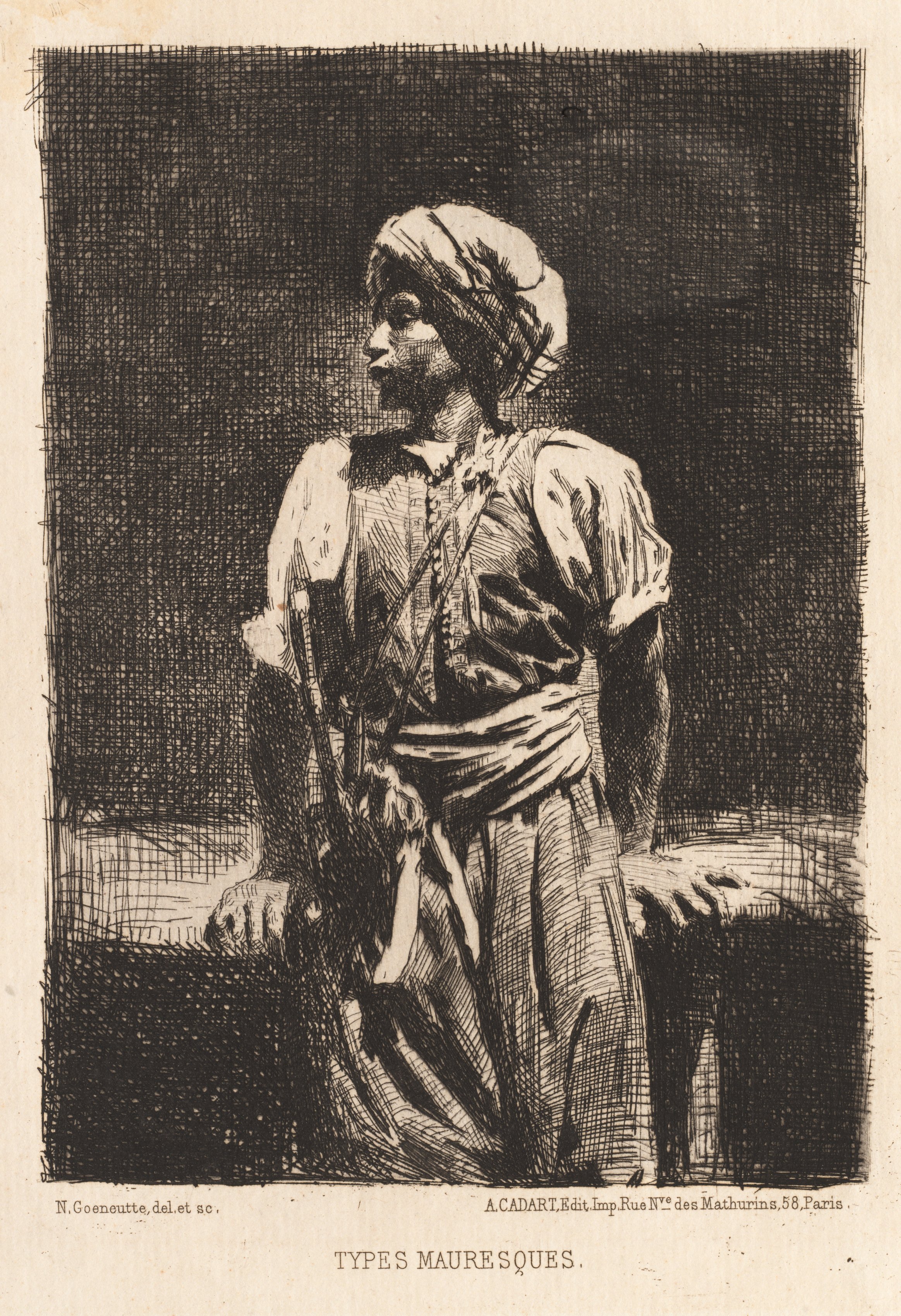Black and white drawing of a man wearing a robe and turban, standing with his right hand on a surface; a dagger or sword at his left side. The man faces left, looking slightly up and to the left; only the top half of his face is visible. The robe covers his body from neck to ankles, and features billowy short sleeves; it wraps around his waist. The turban covers most of his head. The surface he rests on appears to be a low wall or ledge. The background is dark. The title "Types Mauresques" and artist "Norbert Goeneutte" are associated with the image.