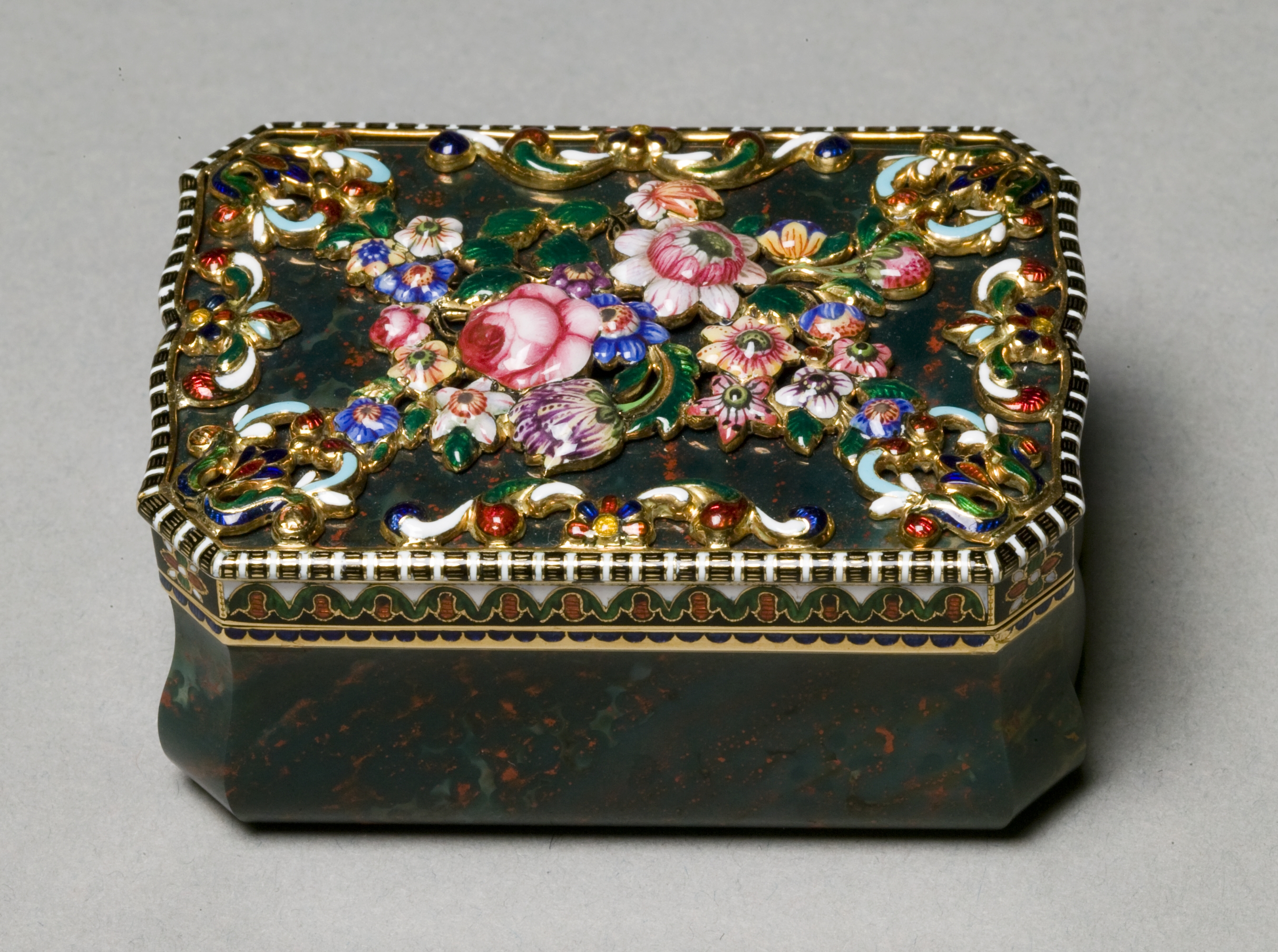 The Snuff Box by Jean-Louis Richter is a small, rectangular box with a flat top and slightly curved sides. The box has a dark green base color with orange-brown speckles. The top of the box features a floral design with pink, white, blue, and purple flowers. The flowers and leaves are outlined in gold and have a shiny enamel finish. The border around the top of the box is gold with small white, blue, green, and red details. The edges of the box have a gold and white striped pattern. The box sits on a light gray surface.