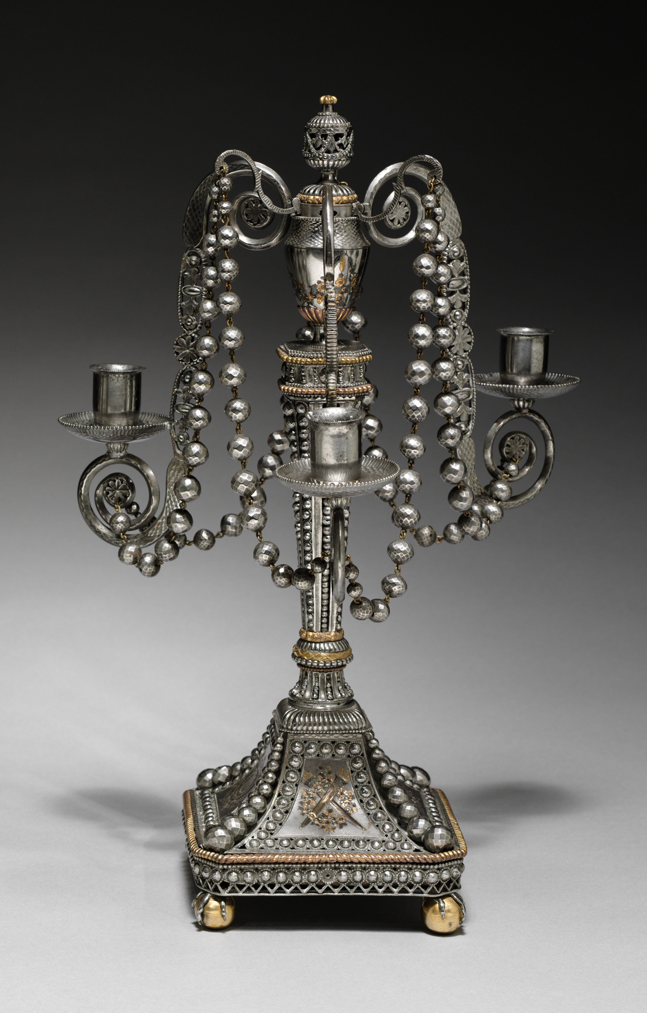 Silver candelabra with two candle holders. Base is triangular with gold feet. Strings of silver beads draped over the frame. Central column has a decorative design. Top features a crown-like element.