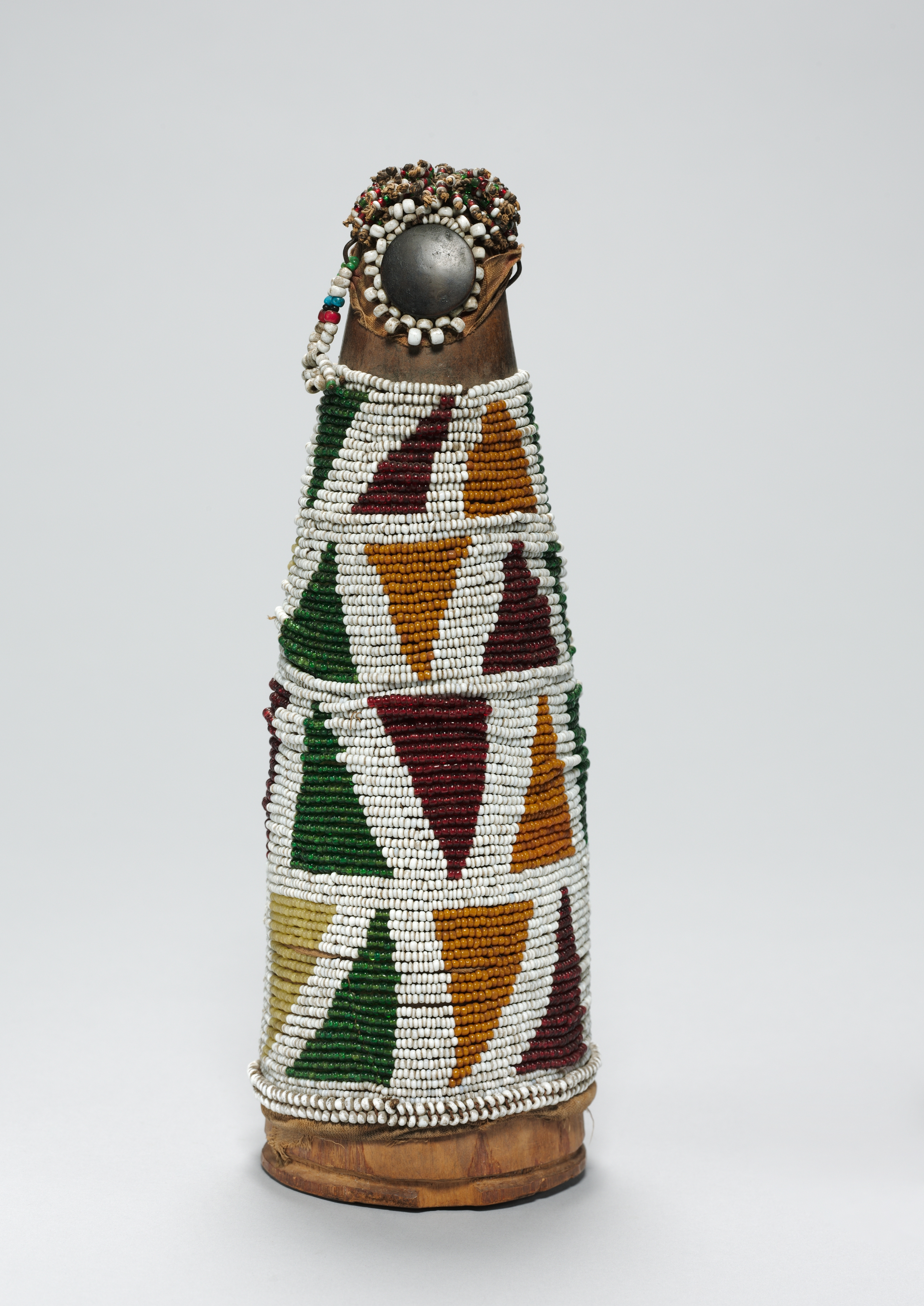 The object in the image is a tall, cone-shaped figure covered in beads. The figure is made of wood and features a large metal sphere on top, surrounded by a circle of small white beads. A collection of beads in various colors is piled on top. The majority of the figure is covered in rows of small white beads arranged in a triangular pattern, with triangles colored green, orange, red, and yellow. The base of the figure appears to be made of a lighter-colored wood and is flat. The background of the image is a plain light gray color. The title of the piece is "Figure (kgöngwana-tshingwana/Ngwana sehô)" by an unknown artist.