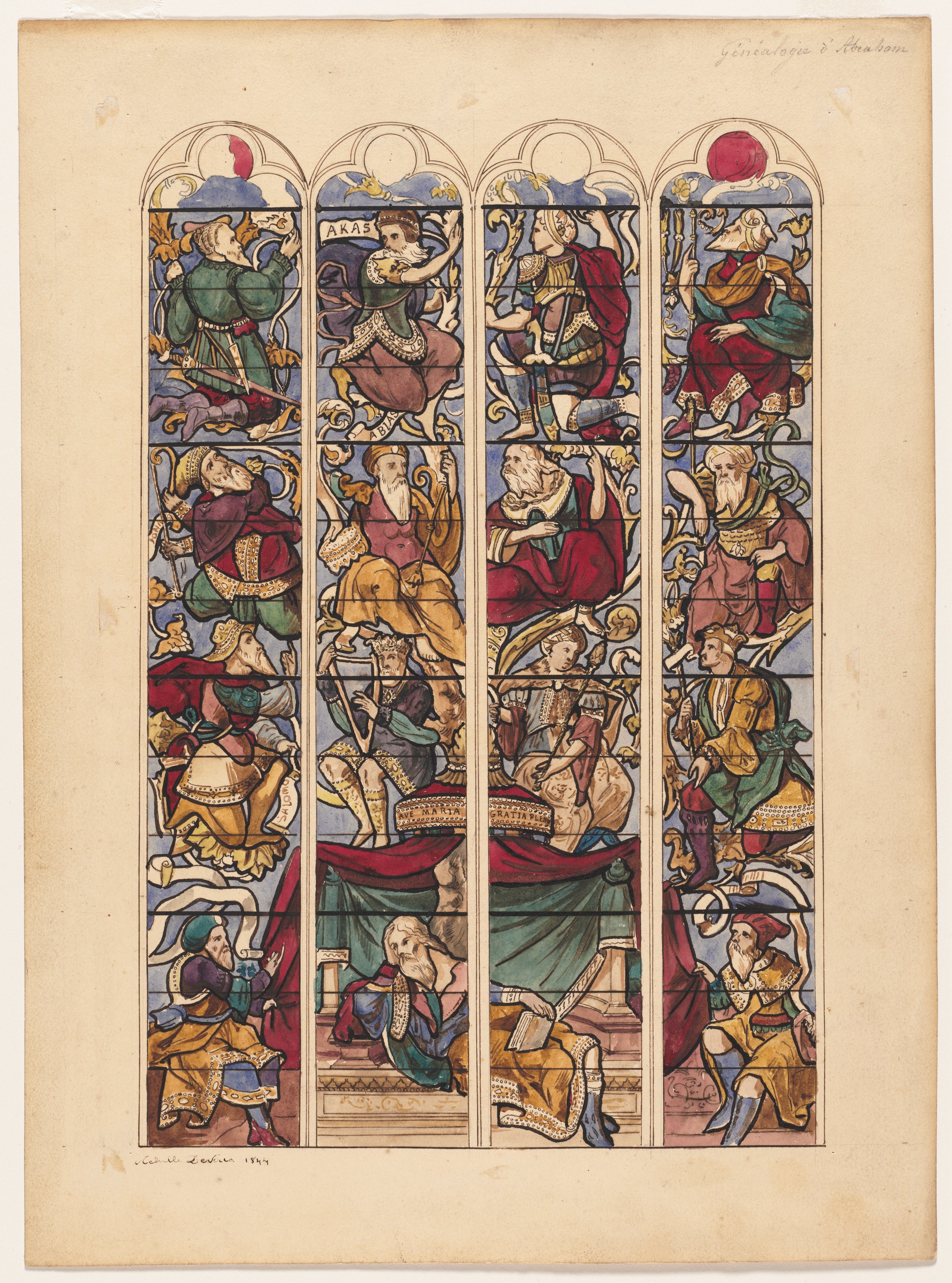 Four vertical stained-glass window panels with rounded tops, each containing multiple figures. The panels are set against a beige background. The leftmost panel depicts a man wearing green and a woman wearing purple. The second panel shows a man with a word 'ARAS' near him. The third panel features a seated man in a red cloak and another man kneeling. The rightmost panel shows a man with a staff. Each panel contains additional figures in various poses. The color palette includes red, green, yellow, blue, and purple. The figures wear medieval-style clothing. The panels are separated by thin beige lines. The overall design resembles a study for stained-glass windows.