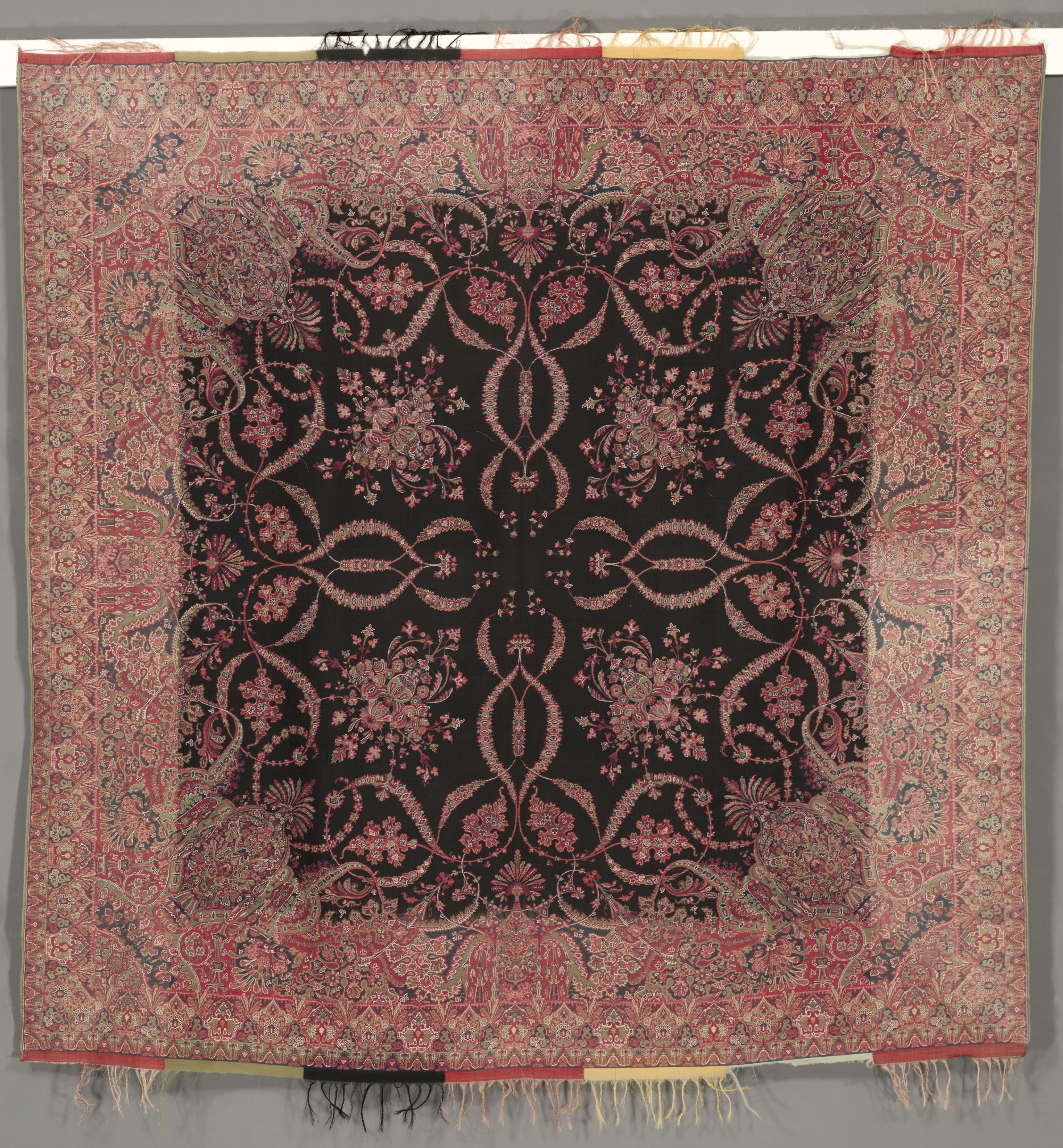 The shawl features a square shape with a black center. The center has a symmetrical floral pattern in pink. A border surrounds the center. The border features a repeating design with floral patterns and geometric shapes in pink, red, and green. The shawl has tassels along the bottom edge and is hung on a rod. The title is "Square Shawl in Renaissance Style with Black Center and Quarter Shawl Layout". The artist is not visually identifiable.