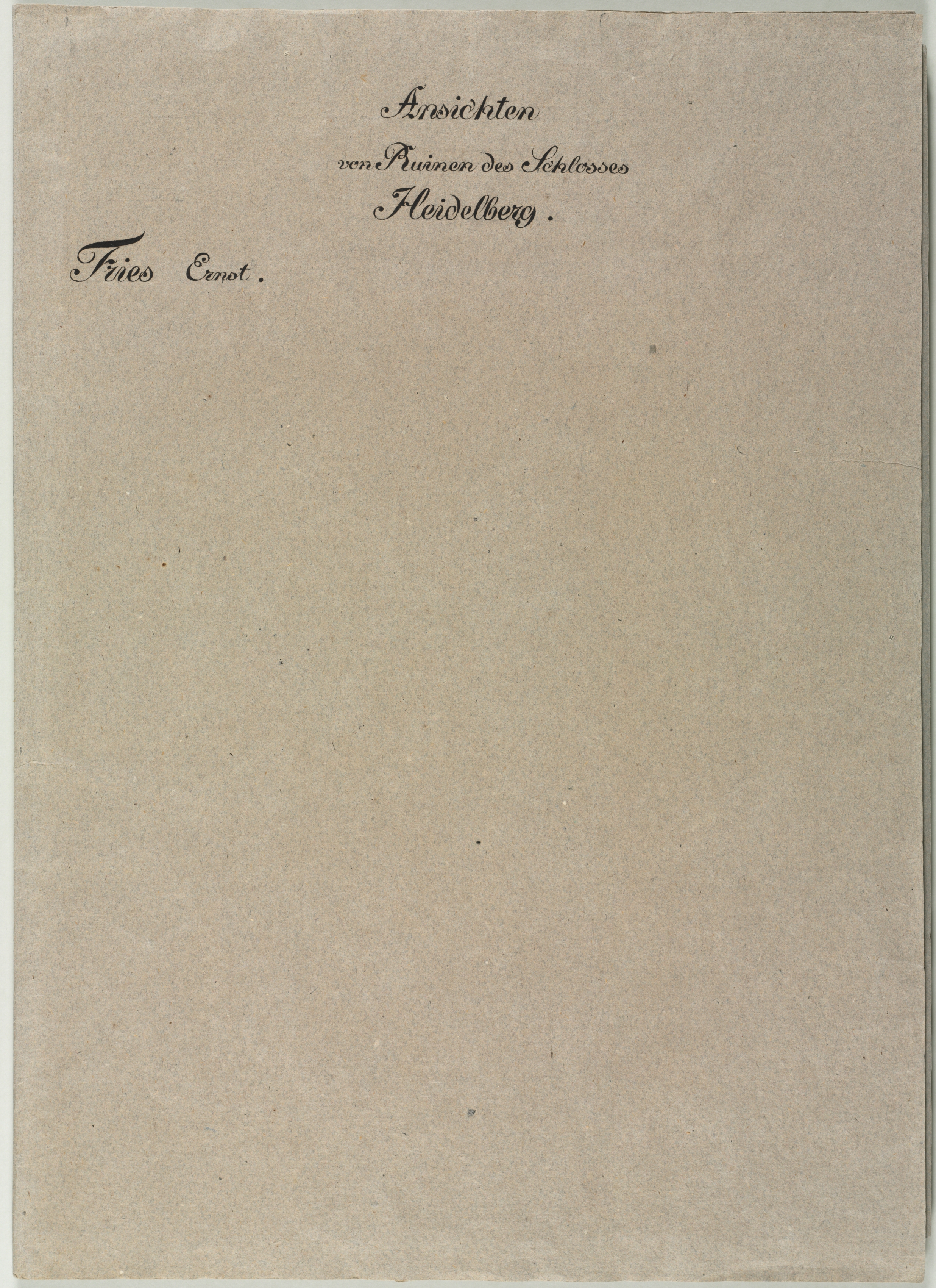 Brown paper with darker brown speckles. The top third of the image shows black cursive writing. The first line reads "Ansichten". The second line reads "von Ruinen Des Schlosses". The third line reads "Heidelberg". The fourth line reads "Fries Ernst". The writing is right-aligned.