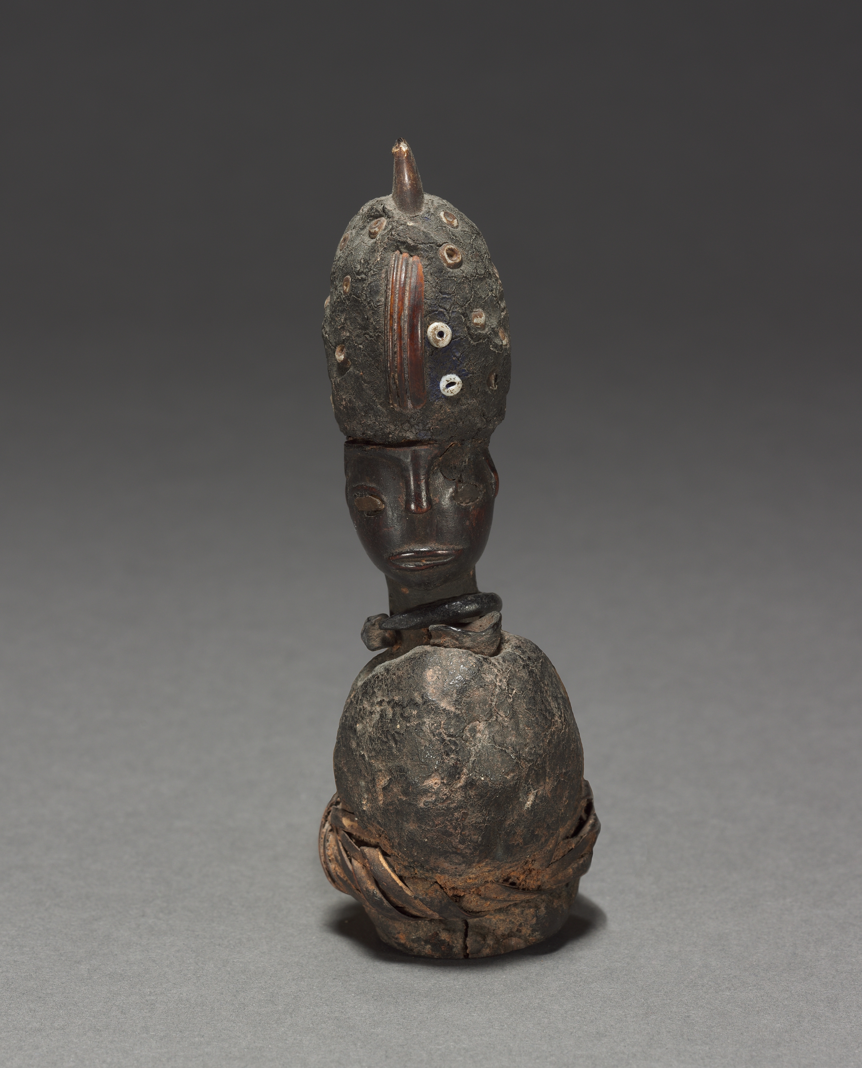 Dark brown wooden power figure, Nkisi, with elongated head, featuring a smooth face and a bulbous body wrapped with carved wooden material. The head has a small protrusion on top and is adorned with two white circular objects for eyes and a vertical brown piece down the center. Several holes of varying sizes are scattered across the head. The figure has a dark background that gradates from light to dark gray.