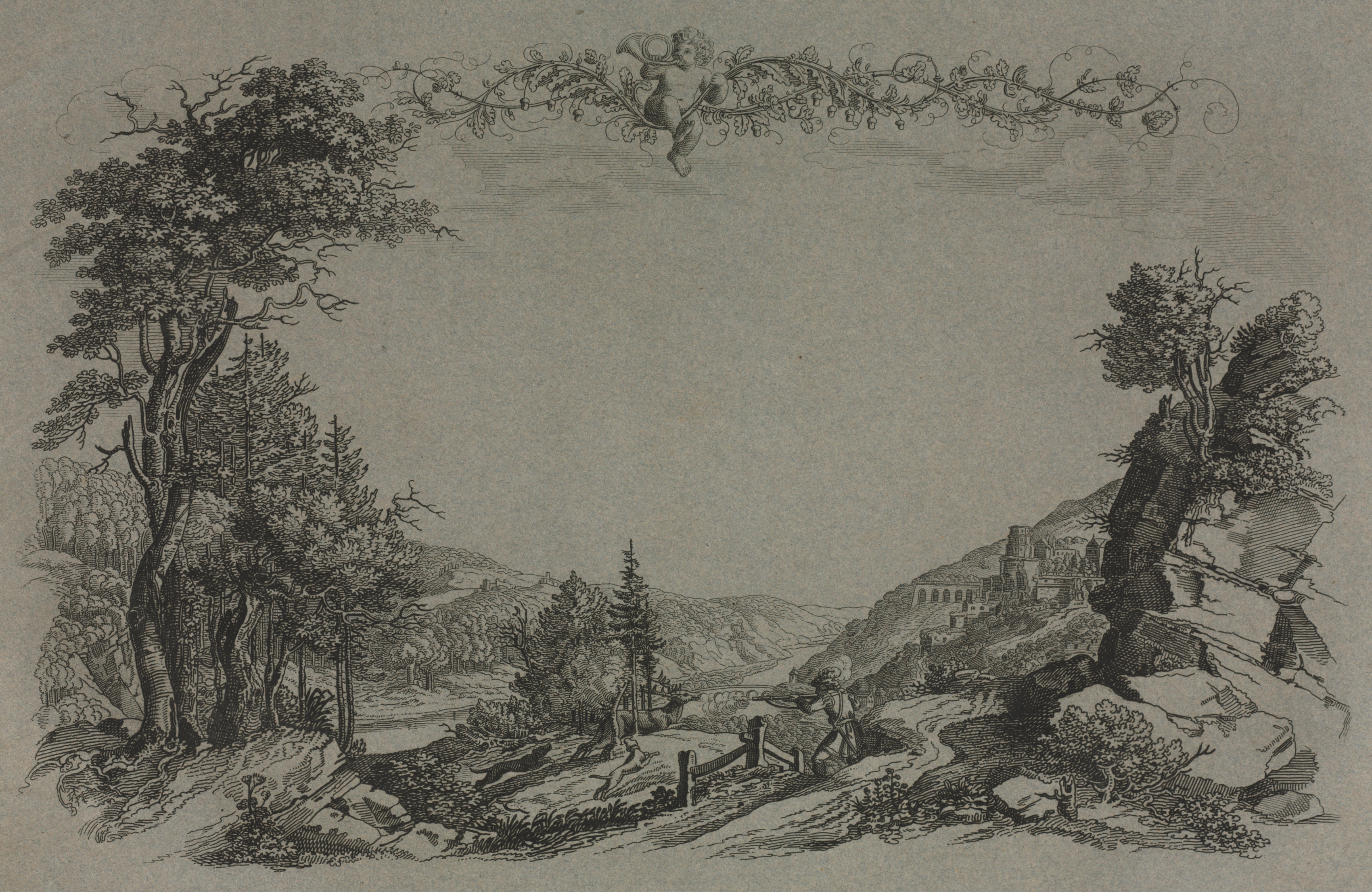 Black and white landscape drawing. A border at top center with leafy vines and a cherub. Large tree on left. Buildings on hilltop right. Hills and trees in background. A dirt path with a fence in the foreground. Sky takes up a significant portion of the image.
