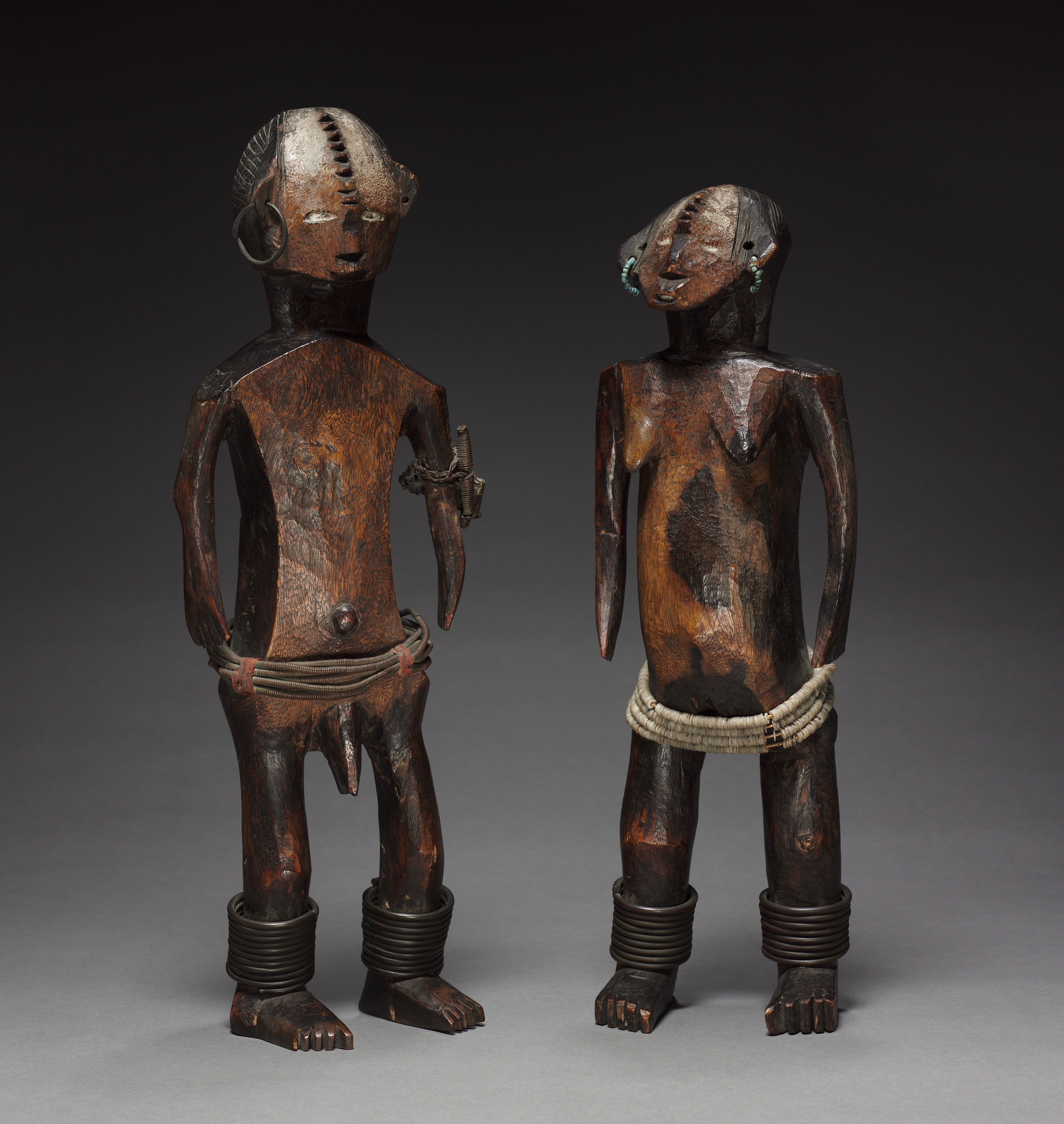 The image shows two wooden statues. The statues are brown with darker brown and black accents. They have a similar shape and design. The statues have a head, neck, body, arms, and legs. Their heads are shaped like a human head with a face, and their bodies are shaped like a human body. The statue on the left has a coiled cord around its waist and a cord wrapped around each ankle. A curved object resembling a weapon is tucked into the cord on its waist. The statue has a large circular earring and short hair on the sides of its head. The statue on the right has a coiled cord around its waist and a coiled cord around each ankle. It has green beads around its ears. The background is dark gray at the top and light gray at the bottom.