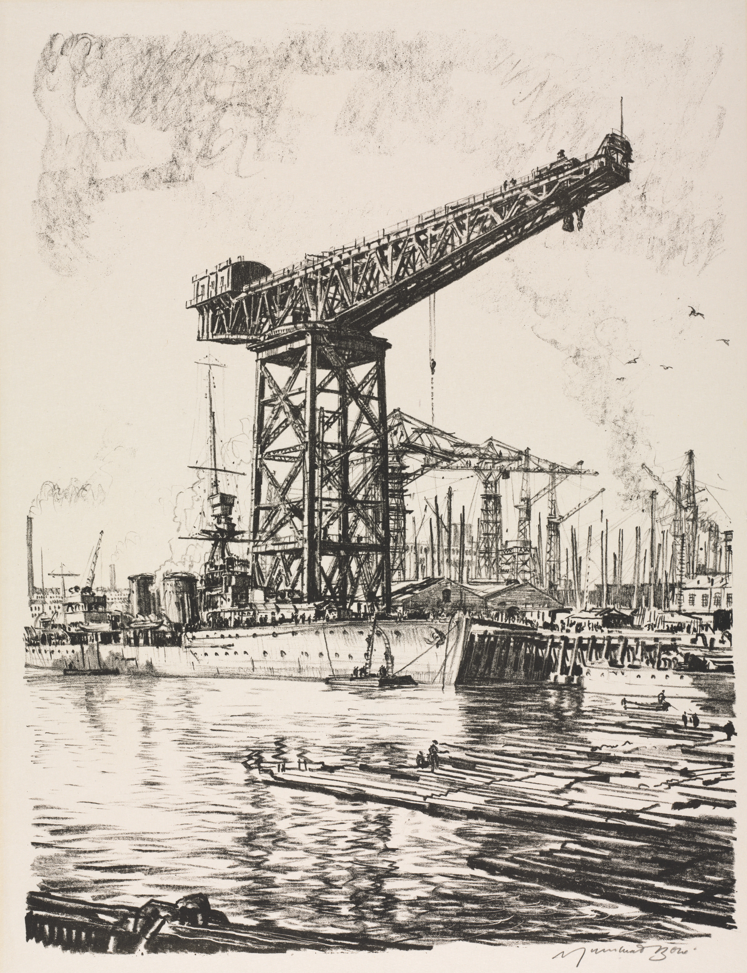 Black and white drawing of a large shipyard scene. A large ship sits on the left side of the water. A large crane extends over the ship from the right side. Several cranes are visible in the background on the right. A fitting out basin is shown with a low wall on the right. Small boats are on the water. A bird flies in the sky on the right. The drawing is signed near the bottom right corner.